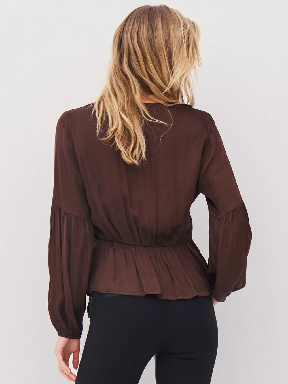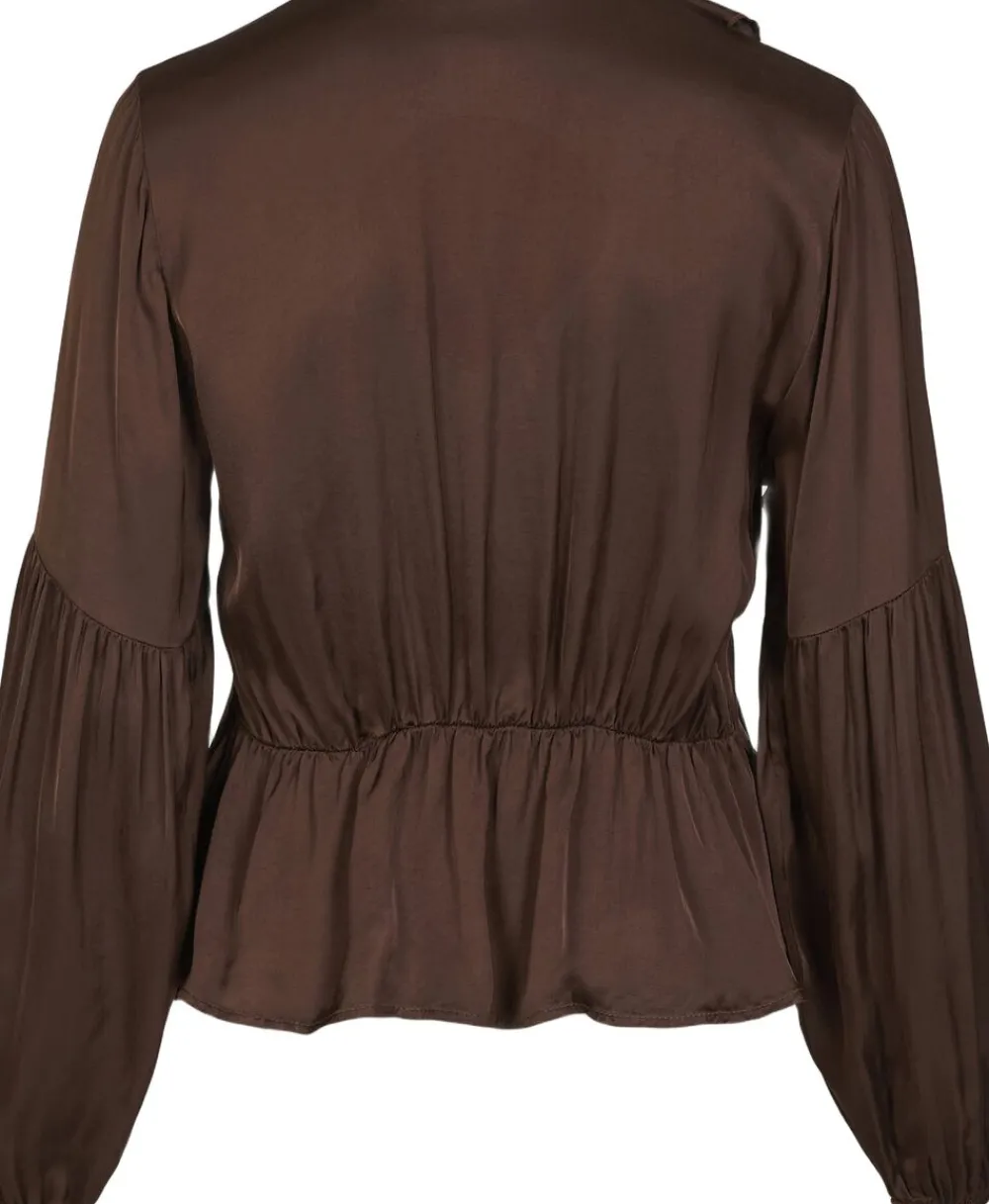 Blusen har en let og blank finish med elegante flæsedetaljer foran, hvilket skaber en feminin og livlig silhuet. Den har lange, voluminøse ærmer med rynker og en diskret elastik i taljen, der giver en let peplumeffekt og understreger figuren. Den bløde V-halslinje fremhæver det romantiske udtryk, hvilket gør blusen velegnet til både hverdagsbrug og aftenbrug. Style den med et par smalle jeans og støvler for et afbalanceret og moderne hverdagslook. (( Modellen er 180 cm høj og bærer en størrelse S. )) (((- Flæser foran. – Elastik i taljen. – Voluminøse ærmer. )))