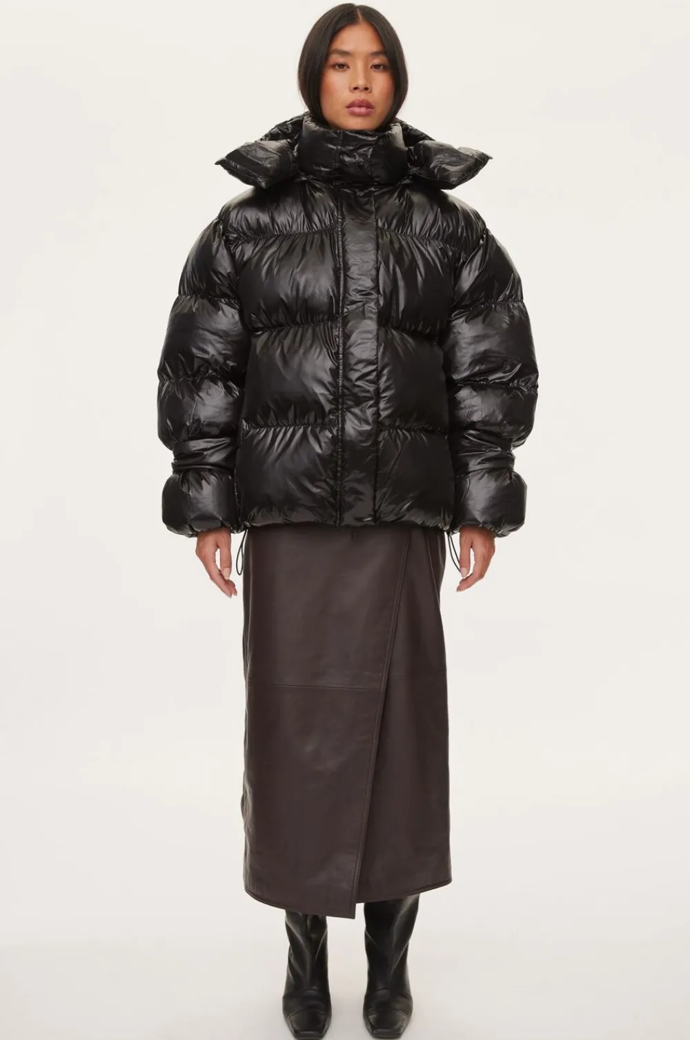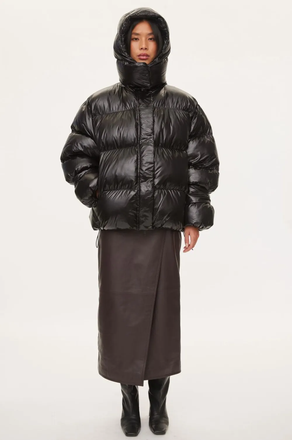 Pufferjakke med hætte. Fremstillet med Recycled polyamid og polstret fyld. De har en høj krave med stolpelukning, skjult lynlås og trykknaplukning foran. Aftagelig hætte, der fastgøres med lynlås, og to skjulte sidelommer. Elastisk snøre med stoppere i taljen og nederst på ærmerne og elastiske manchetter. Fuldt foret. Løs pasform med en voluminøs silhuet, der kan trækkes ind med snoretræk