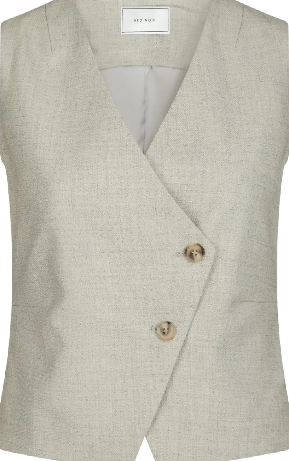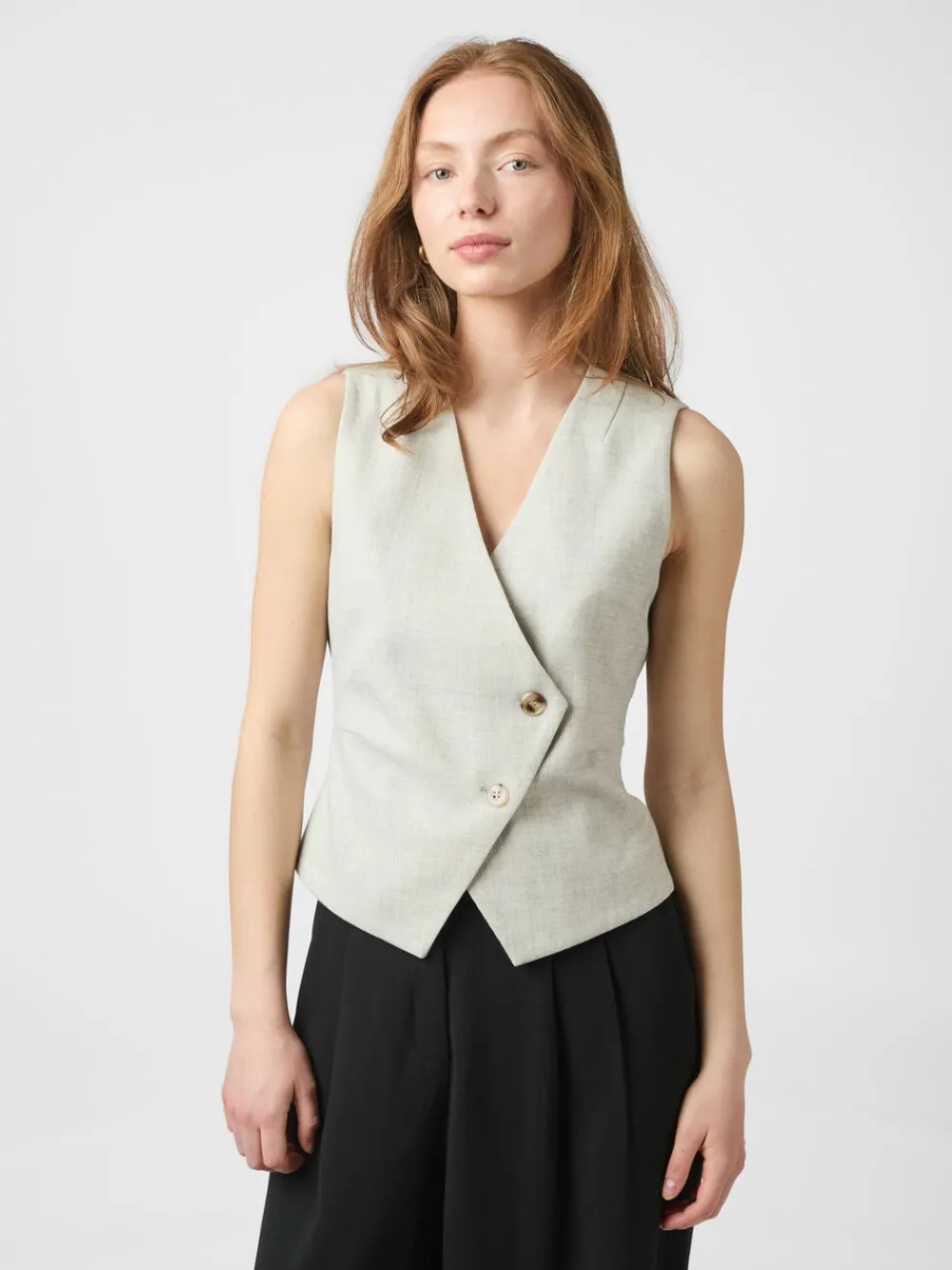 Kort vest med slå-om-detalje. Vesten har en v-halsudskæring, er ærmeløs og har en asymmetrisk lukning med to knapper foran. Den kan bruges alene eller med en top under. Pasformen er tætsiddende. Modellen er iført størrelse 36.