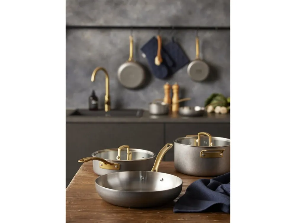 Fremstillet af 18/10 rustfrit stål med en kraftig 2,5 mm 3-lags konstruktion af rustfrit stål, aluminium og rustfrit stål. Mellemlaget af aluminium sikrer optimal varmefordeling. Pånittede støbte stålhåndtag, som er PVD-forgyldt. Ydersiden har en vintage polering. Passer til alle varmekilder inkl. induktion. Tåler opvaskemaskine.