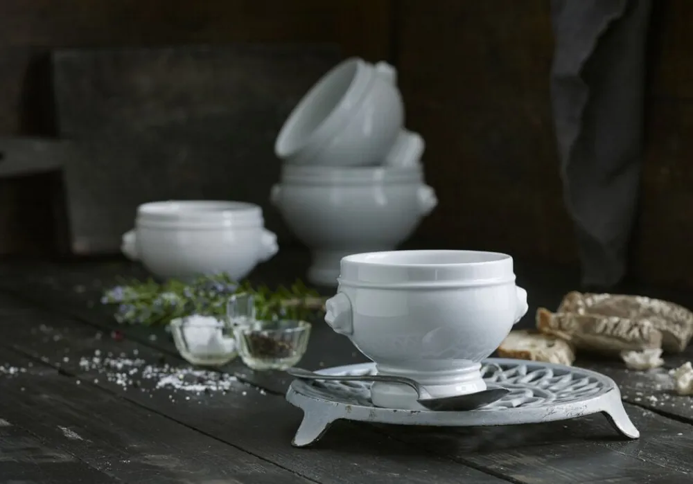 Pillivuyts klassiske hånddrejede suppeskål med løvehoveder som hanke, der kan indeholde 40 cl.