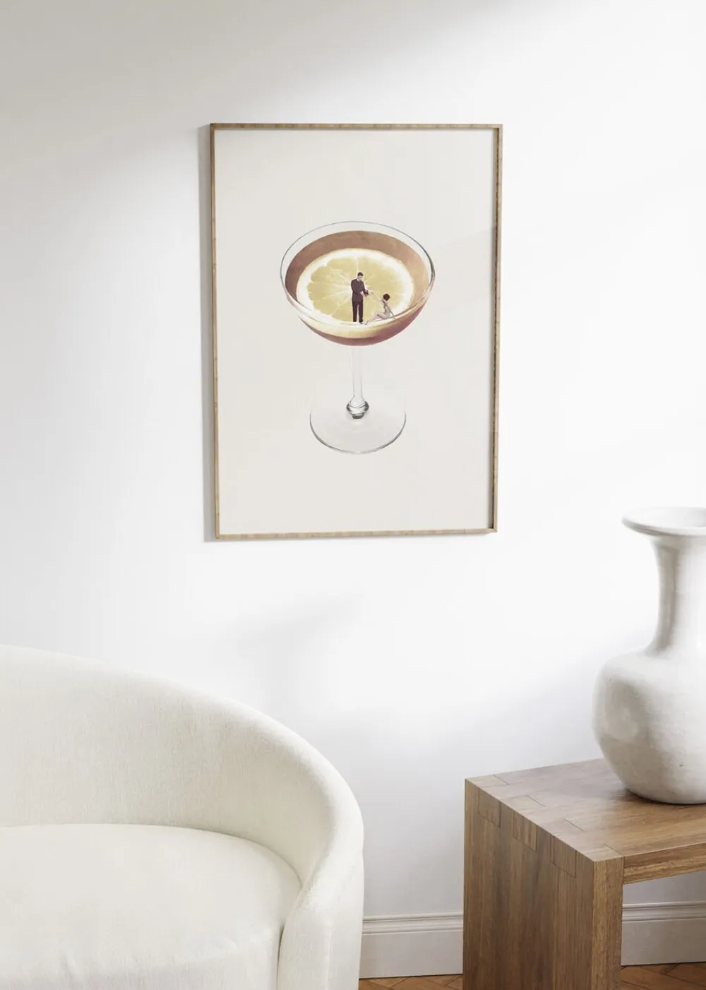 The poster “My drink needs a drink” by artist Leon Maarten showcases a playful scene of a woman and man sitting on the edge of a drink glass, implying their need for a drink. The color scheme consists of brown, yellow, and white, with a touch of humor and love. The use of collage adds an interesting and unique aspect to the artwork, making it a great addition to any living space or bar area. *Please note that frames are sold seperately.