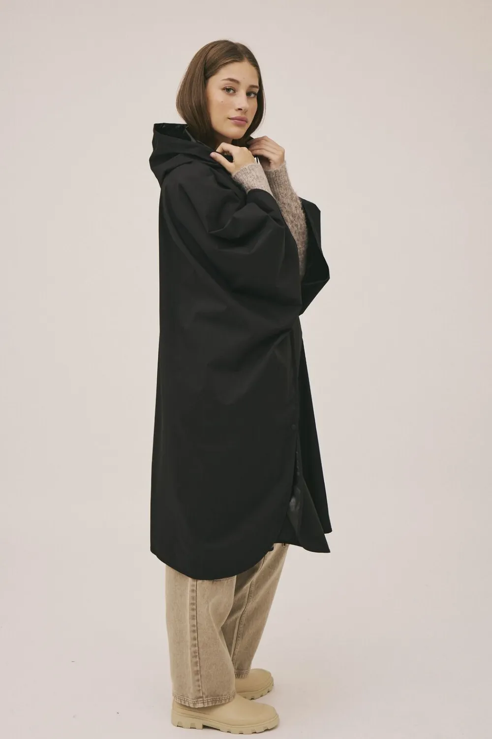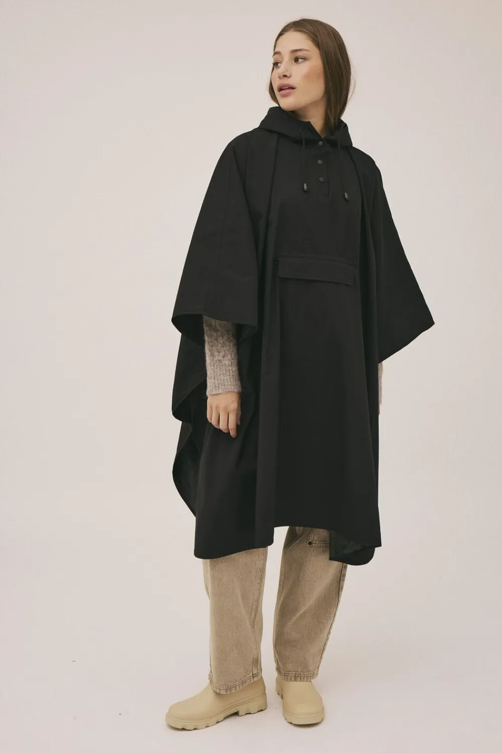 Regnponcho fra Magasin du Nord Collection i 100% genanvendte fibre med GRS-certificering. Ponchoen har trykknapper på fronten og langs siderne, hætte med snøre samt en praktisk forlomme, som ponchoen kan pakkes ned i, så den er nem at have med på farten. Med en water column pressure på 5000 mm er den både vandtæt og funktionel. En stilren regnponcho, der holder dig tør i al slags vejr.