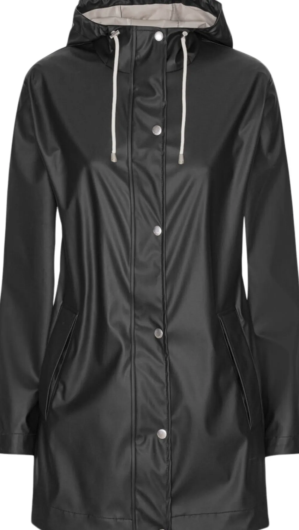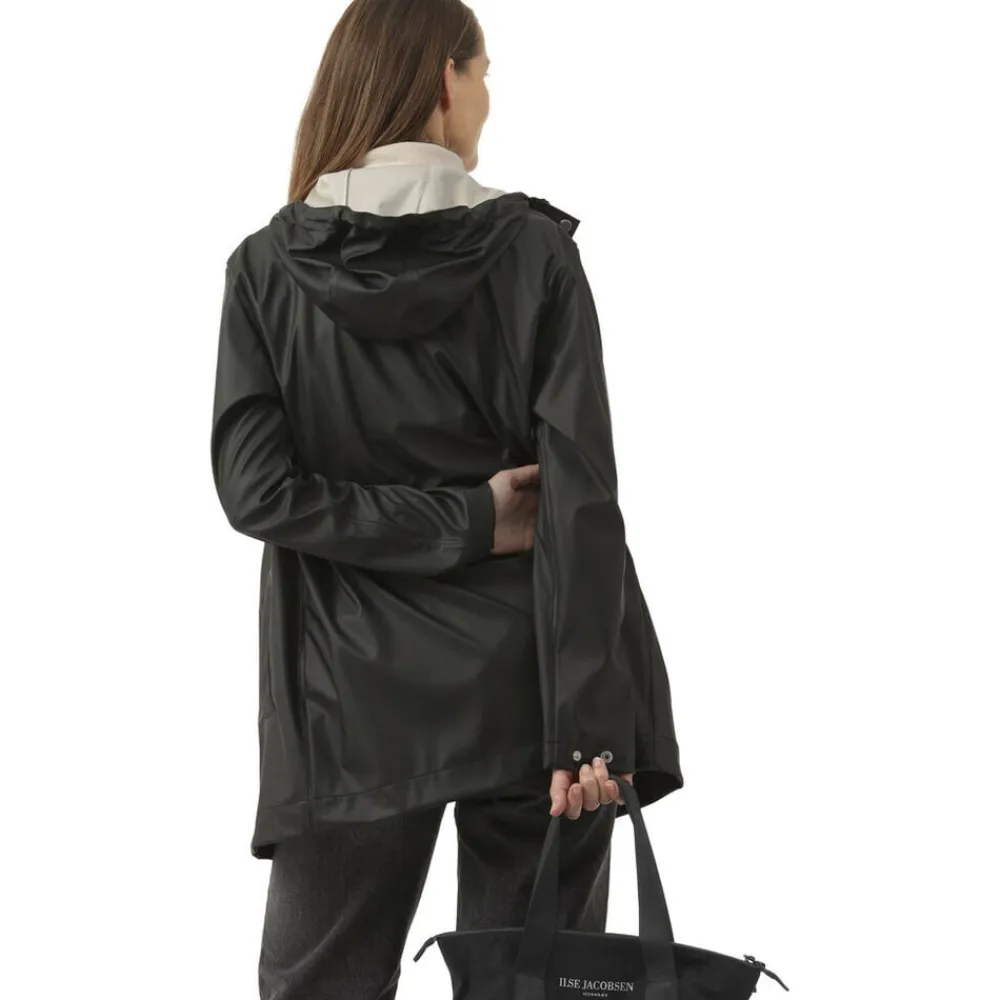 Denne nye, moderne garderobeklassiker er en regnfrakke med lige pasform i slidstærkt, let, gummibelagt, vandtæt PU-belagt stof. Den er fremstillet af eksperter og skræddersyet med svejsede sømme for komplet beskyttelse mod regnen og med en Recycled tricot-bagside for komfort. Hætten med snoretræk med bomuldslook og snørehuller under armene giver bevægelsesfrihed og komfort i ubehageligt vejr. Denne kvalitet tilbyder vejrbeskyttelse med en vandtæt klassificering på 5000 mm.