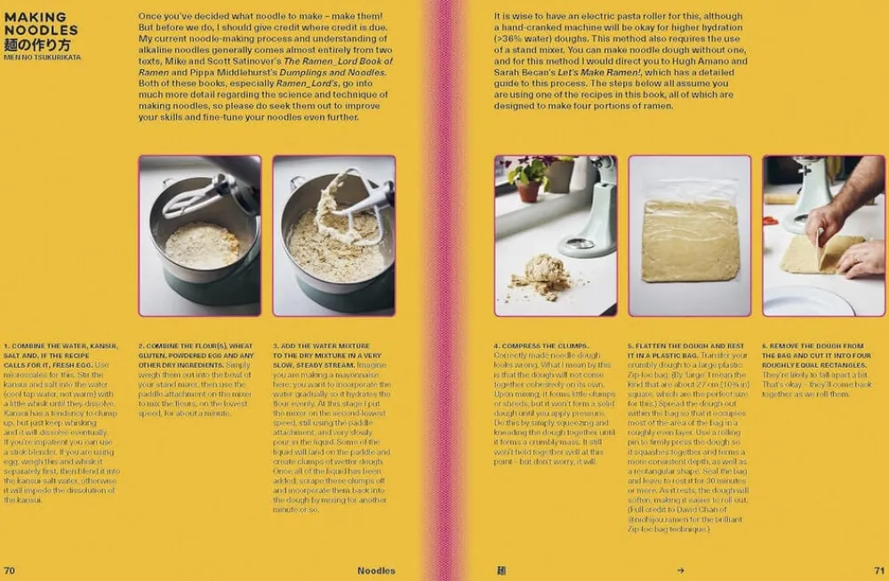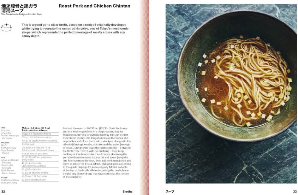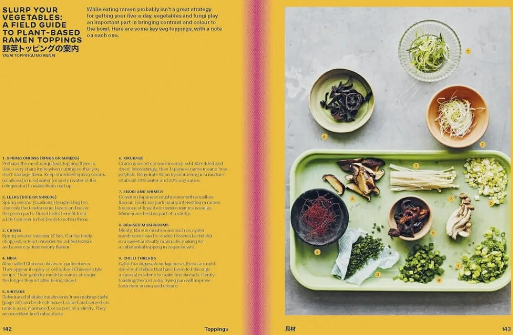 Det er opdelt i fem sektioner – Broth, Seasoning, Aromatic Oils and Fats, Noodles og Toppings – for at gøre det muligt for dig at blande og matche for at skabe din egen ramen, der passer til din smag. Alternativt kan du vælge at følge en af flere komplette ramen opskrifter.