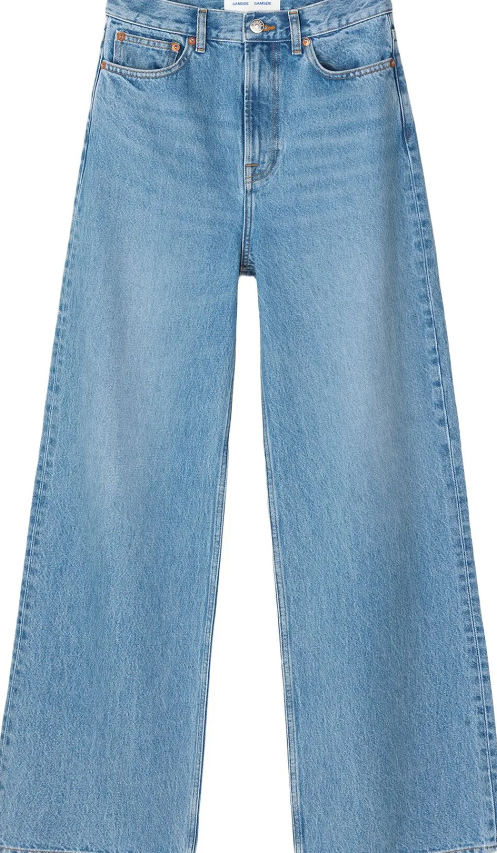 Højtaljede jeans med vide ben. Lynlås i gylpen, bæltestropper. Western-stil med fem lommer. Lyseblå vintage-vask med let ældet look. 100% økologisk bomuld, 114 gram denim. Økologisk bomuld.