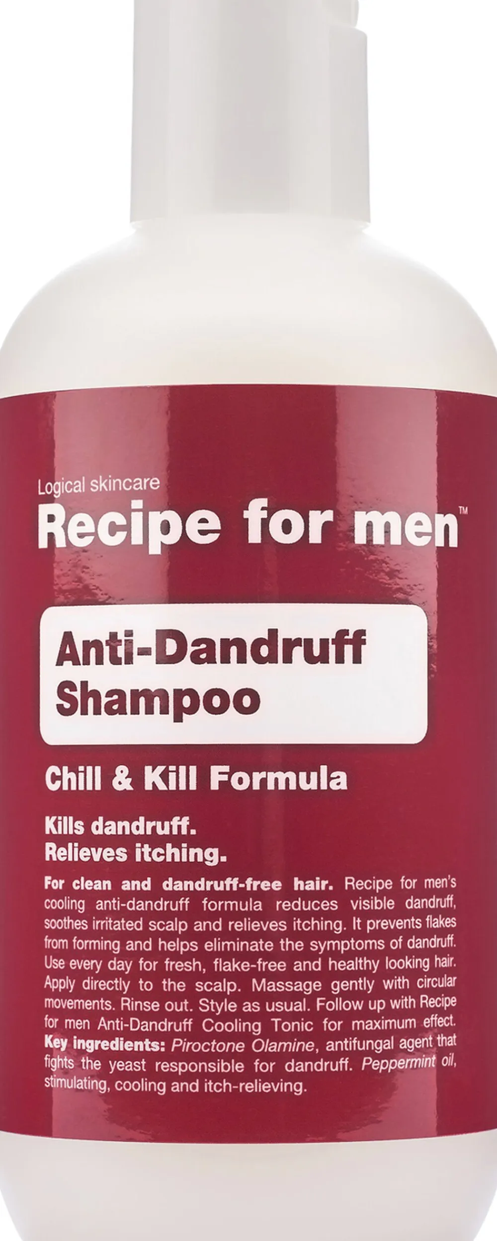 Påfør direkte i hovedbunden. Massér blidt med cirkulære bevægelser. Vent min. 2 minutter, før du skyller ud. Anvend gerne Recipe for men Anti-Dandruff Cooling Tonic efterfølgende for optimal effekt.