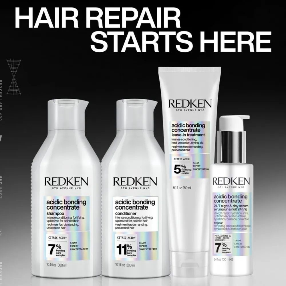 Professionel formel! Redken Acidic Bonding Concentrate Leave-In Treatment er Redkens mest koncentrerede alt-i-en-formular til reparation af styrke til alle typer af skadet hår. Denne ultrarige og luksuriøse leave-in-behandling reparerer håret fra skællag til bark og giver reparation af styrke, intens pleje og beskyttelse mod falmet farve.