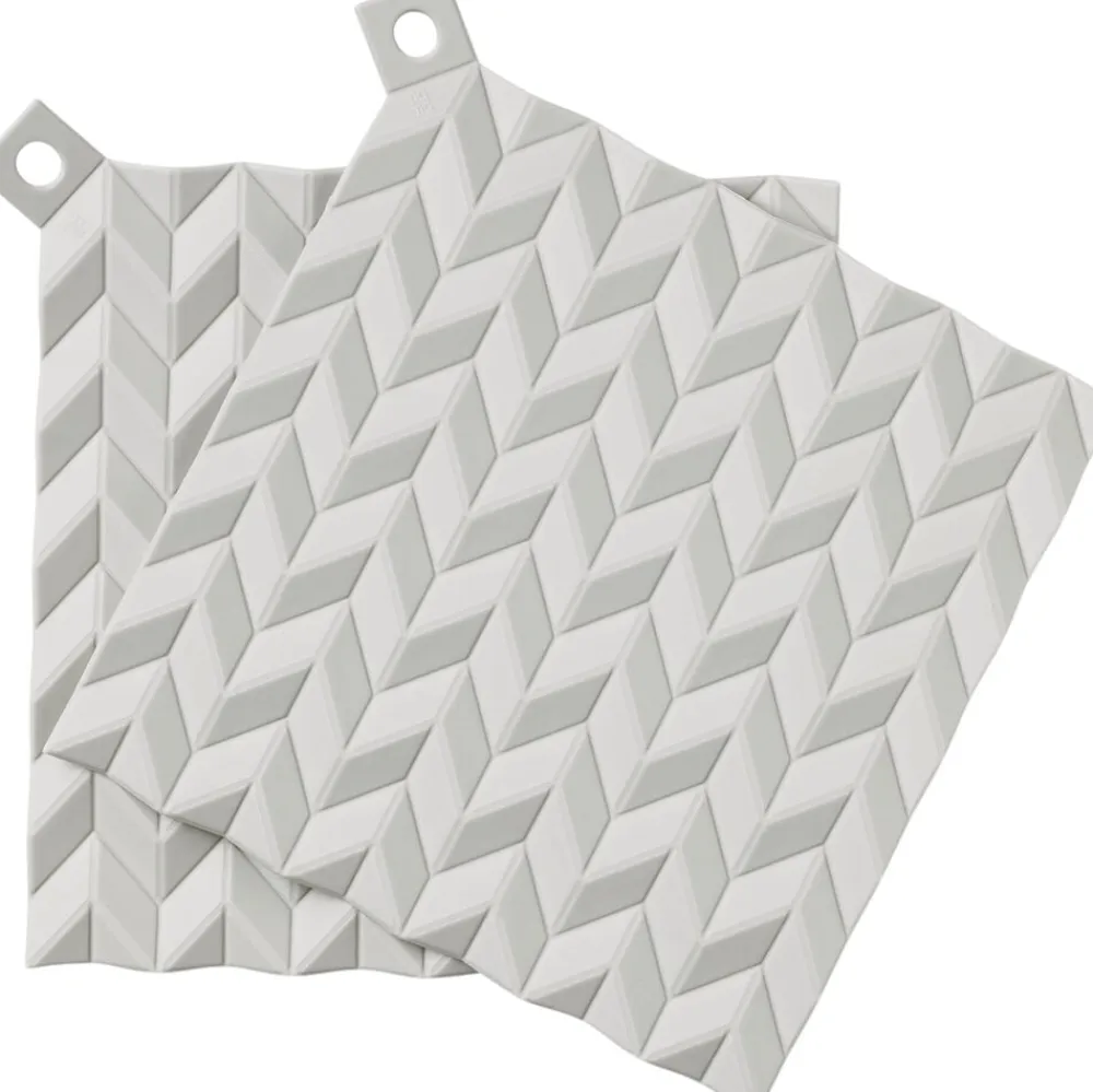 HOLD-ON er moderne grydelapper og bordskånere i ét. De er designet af Søren Refsgaard, der har ladet sig inspirere af den japanske origami foldeteknik. HOLD-ON grydelapper er fremstillet i silikone, der tåler op til 230 °C varme. Undgå at brænde fingrene grydelappernes struktur sikrer et godt greb om gryderne, og så er de endda mere varmeisolerende end konventionelle stofgrydelapper. Giv dem en tur i opvaskemaskinen, hvis de er blevet fedtede.