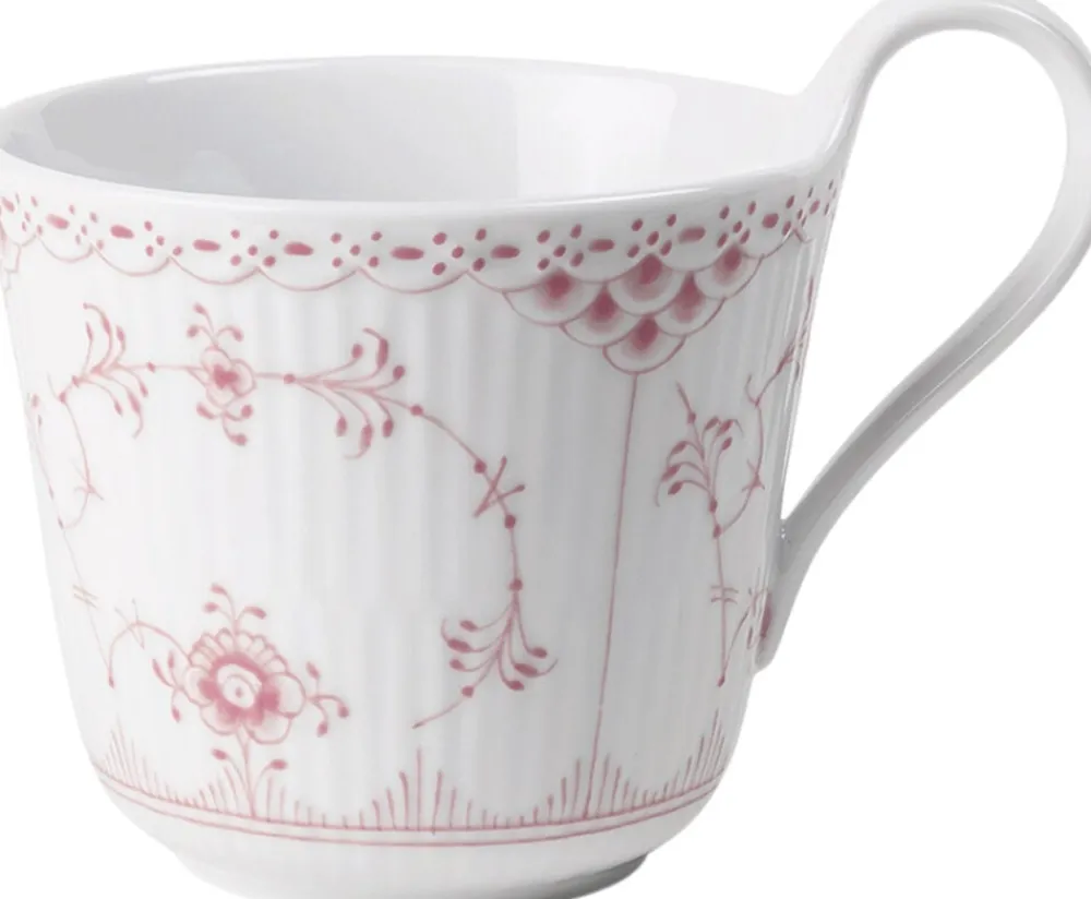 Højhankskoppen i Koral Musselmalet Halvblonde er dekoreret i hånden ved hjælp af in-glaze teknikken, hvor farven påføres før den anden brænding, hvorved malingen smelter sammen med glasuren. Den bløde koralfarve i de detaljerede dekorationer løfter den tidløse form af den elskede højhankskop.