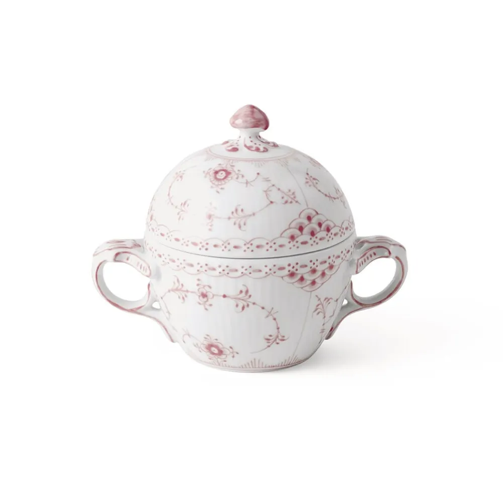 Koral Musselmalet Halvblonde sukkerskål er lige så charmerende som den er dekorativ. Den bløde koralnuance af blomsterdekorationerne tilføjer et strejf af romantik til dette stykke, som er en klassisk tilføjelse til ethvert bord. Håndmalet i in-glasur-teknikken og komplet med det karakteristiske sneglehuslåg, er dette et dejligt stykke porcelæn for den moderne samler.