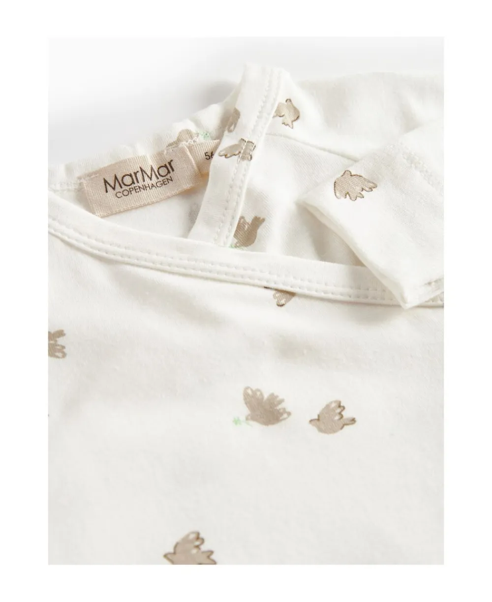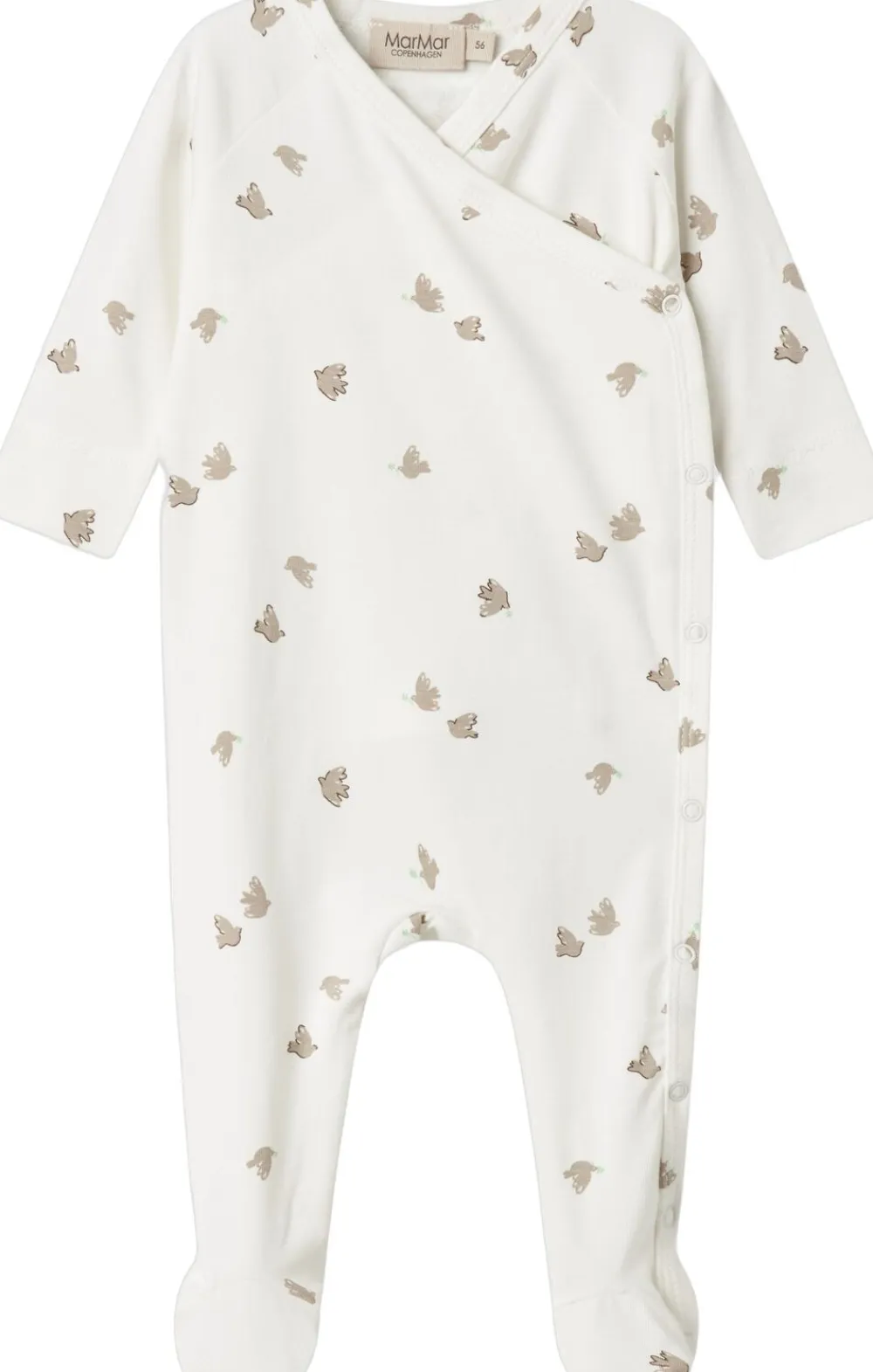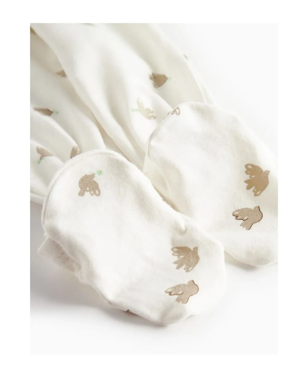 Langærmet heldragt med fødder til nyfødte. Heldragten har slå-om-lukning og lukkes med trykknapper fra halsen og ned langs det ene ben. Heldragten har et fint print og er både blød, strækbar og behagelig at have på.