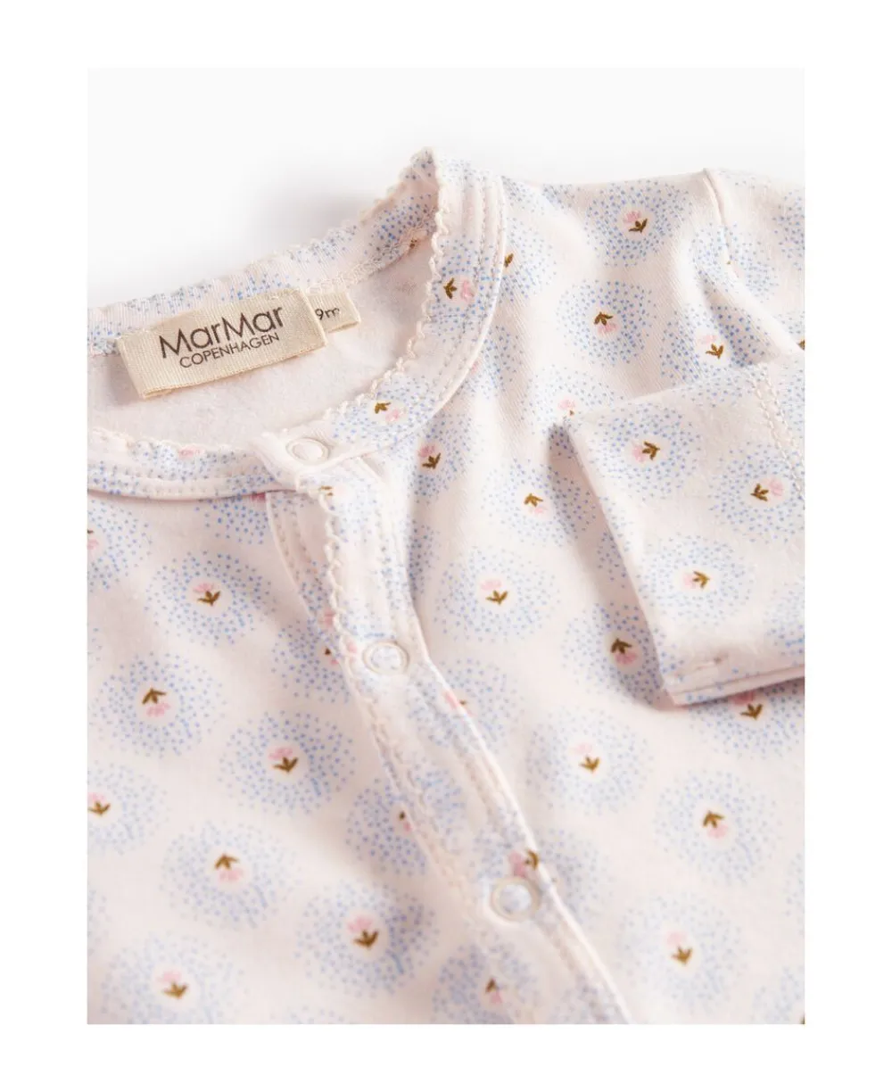 Langærmet baby modal bodystocking med stolpe knaplukning, der bliver lukket med trykknapper mellem benene for nem bleskiftning. Bodystockingen er både ribstrikket, blød, holder form og farve og har elastan i sig som gør den strækbar og behagelig at have på.
