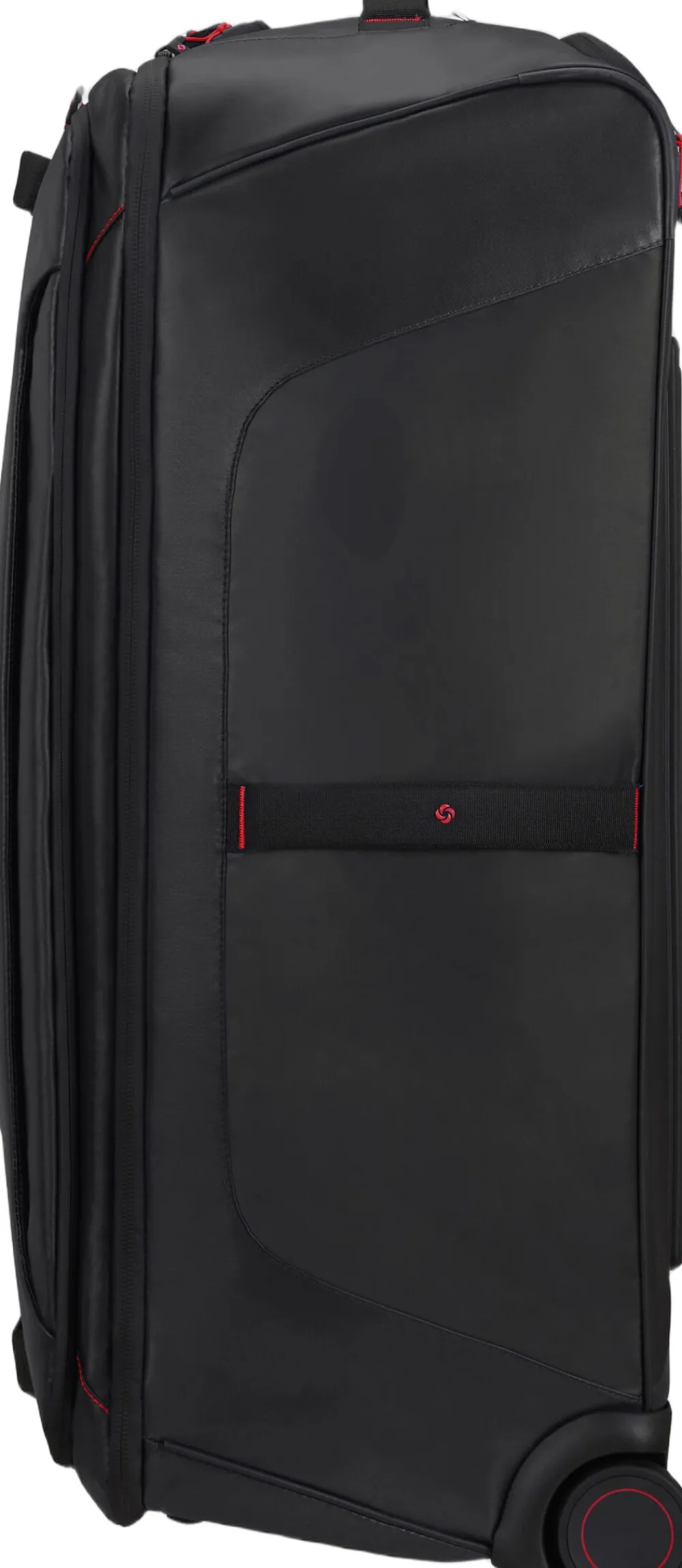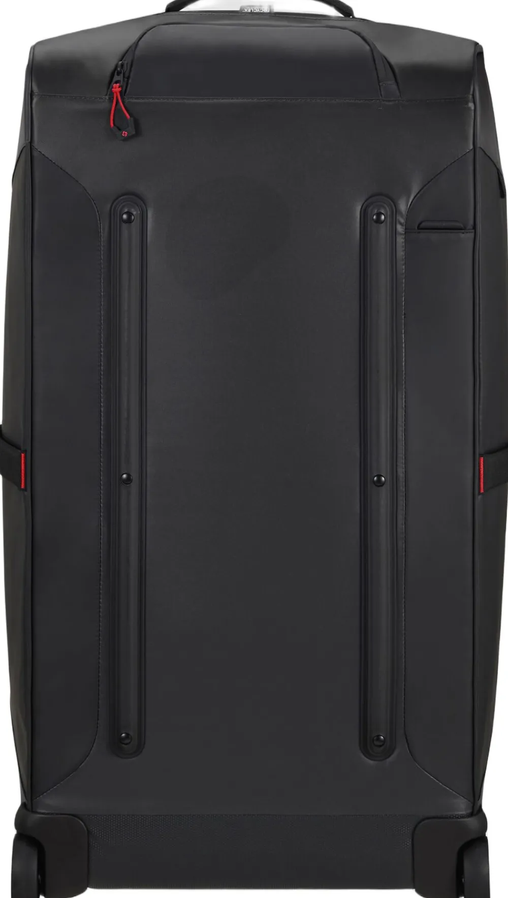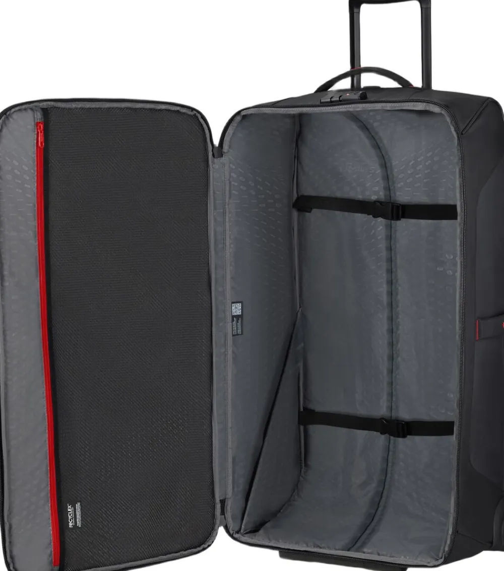 Duffle på hjul hvor både det udvendige og indvendige stof er lavet af genbrugt nylon og polyester, vandafvisende materiale, front og sidelomme, TSA lås, rumindhold 122 liter, vægt 3,4 kg. 5 års begrænset garanti.