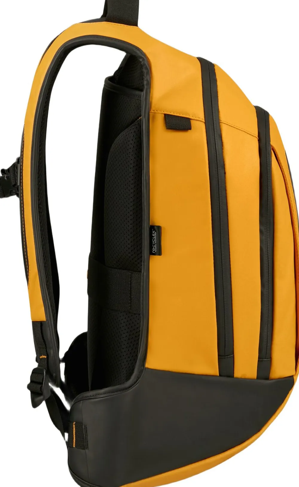 Rygsæk hvor både det udvendige og indvendige stof er lavet af genbrugt nylon og polyester, vandafvisende materiale, frontlomme med refleksdetaljer, ergonomiske stropper, brystrem, plads til 15,6″ pc og 10,5″ tablet, rumindhold 19 liter, vægt 0,9 kg.