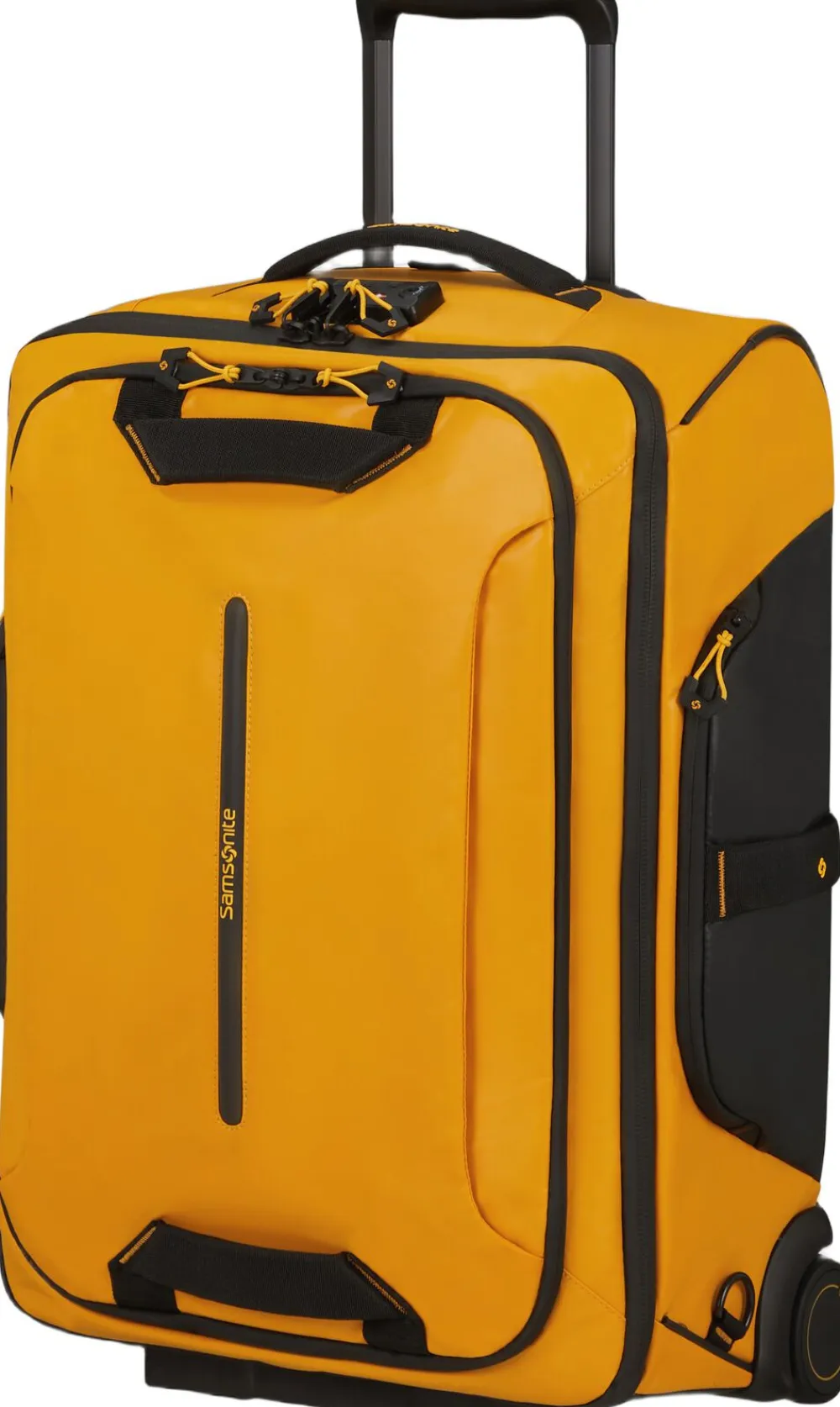Duffle på hjul der også har indbygget rygsæk stropper hvis man kommer i ujævnt terræn, 40x55x25 cm. både det udvendige og indvendige stof er lavet af genbrugt nylon og polyester, vandafvisende materiale, front og sidelomme, TSA lås, rumindhold 51 liter, vægt 2,8 kg. 5 års begrænset garanti.