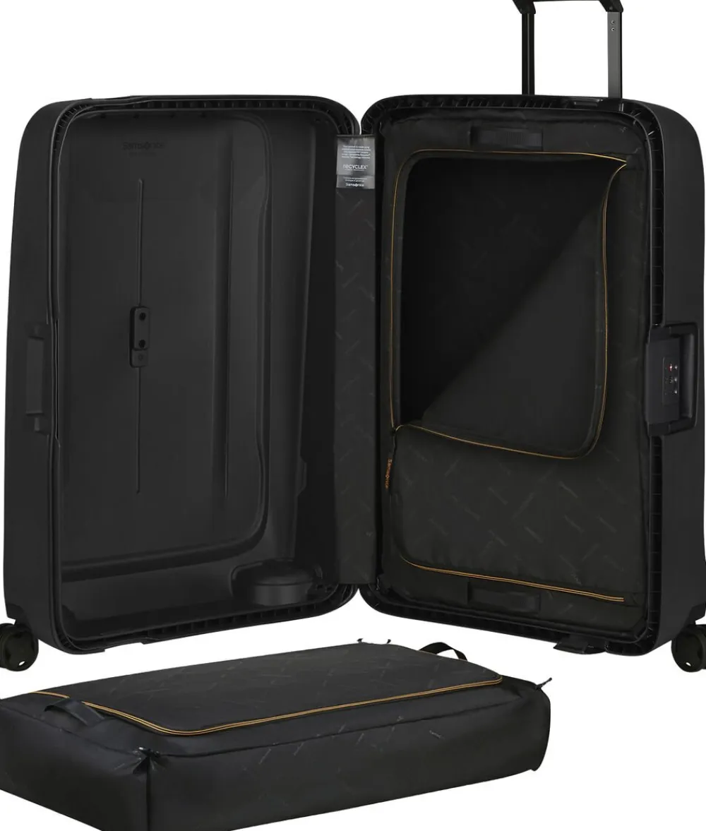 Kuffert med 4 hjul, lavet af minimum 70% genbrugt polypropylen, stoffet indvendigt er lavet af genbrugte pet flasker,3 punkts TSA lås, dobbelt trollystativ, 2 aftagelige pakkeposer, 4,2 kg,navneskilt,rumindhold 111 l, 5 års garanti 75x52x33 cm.