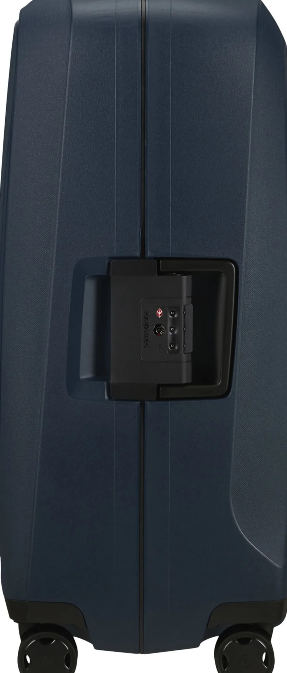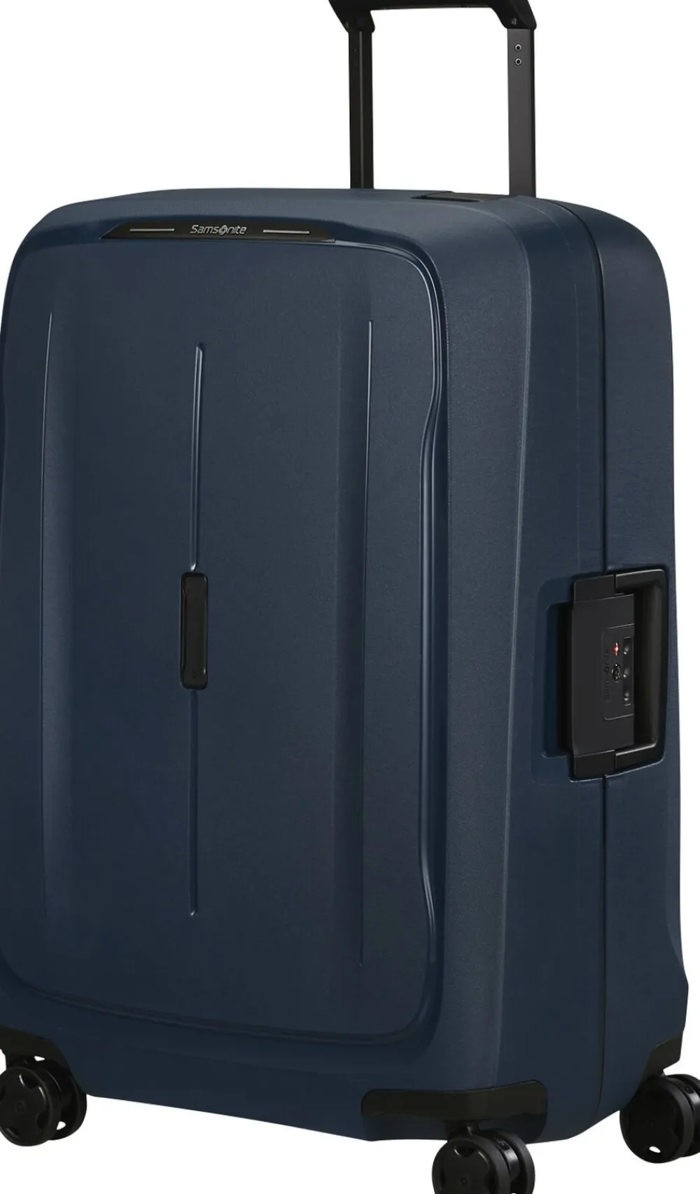 Kuffert med 4 hjul, lavet af minimum 70% genbrugt polypropylen, stoffet indvendigt er lavet af genbrugte pet flasker,3 punkts TSA lås, 2 aftagelige pakkeposer, dobbelt trollystativ, 3,7 kg,navneskilt,rumindhold 88 l, 5 års garanti 69x49x30