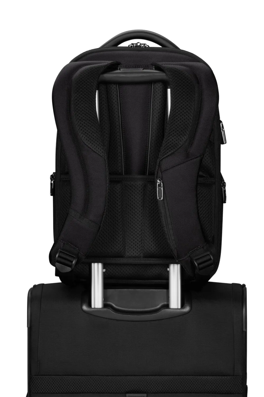 Computer rygsæk i topkvalitet, lavet i balistisk nylon med skinddetaljer på håndtag, plads til 14,1″ PC og 10,5″ tablet, indvendig stof lavet af genbrugsplast, ergomiske stropper, organisation i frontlomme, flaskeholder, smartsleeve funktion så den passer ovenpå din trolly, rumindhold 12,5 l, vægt 1,1 kg. 2 års garanti.