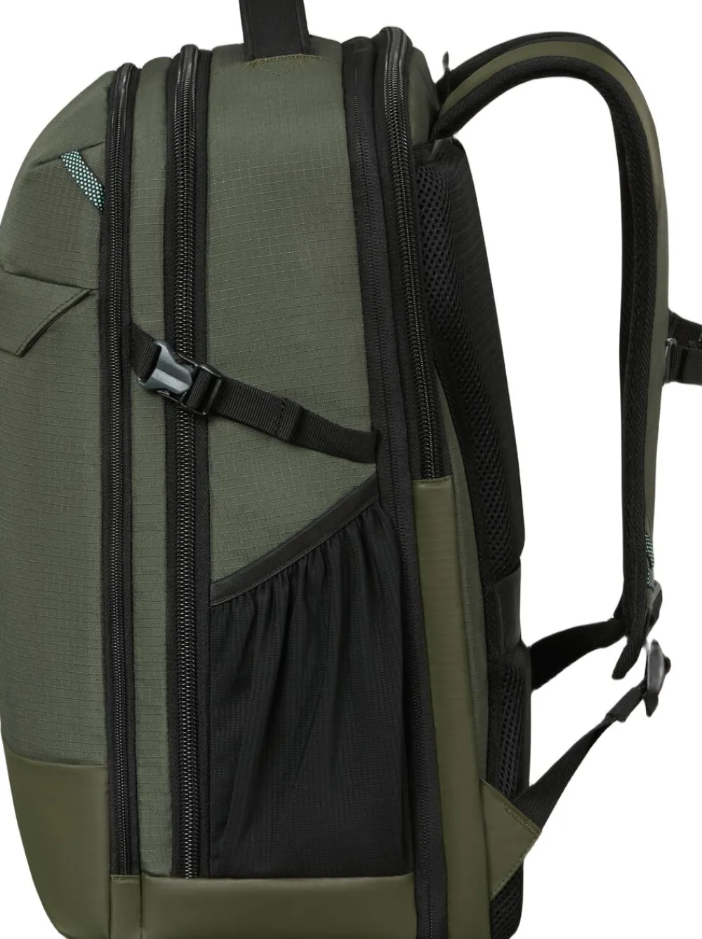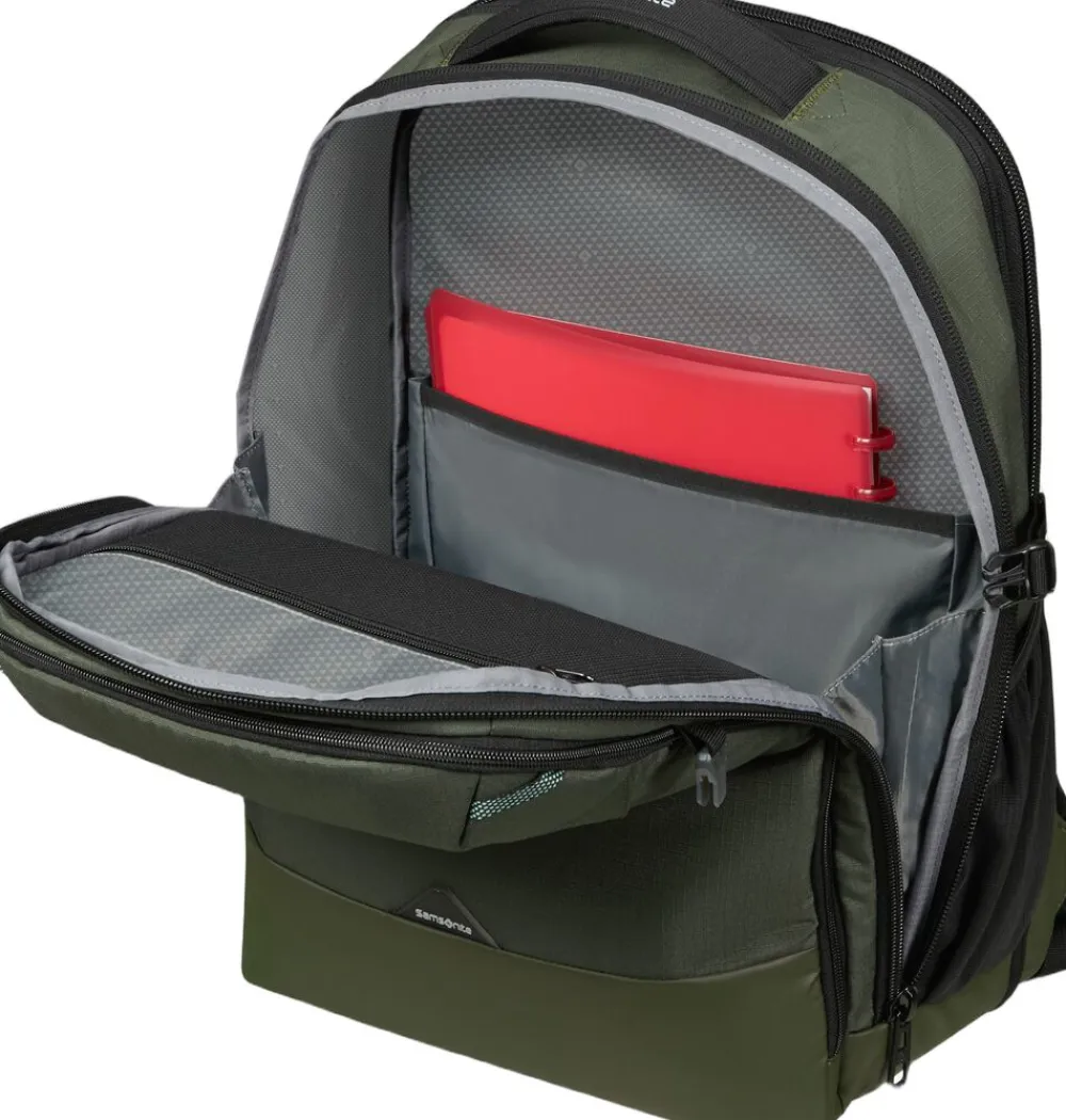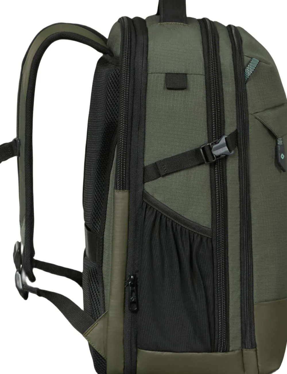 Computer rygsæk med plads til 17,3″ PC og 10,5″ tablet, både det indvendige og udvendige stof er lavet af genbrugsplast, mulighed for udvidelse, flaskeholder i siden, frontlomme med lynlås, regncover, brystrem, ergonomiske stropper, rumindhold 32/40 l, vægt 1,1 kg. 2 års garanti.
