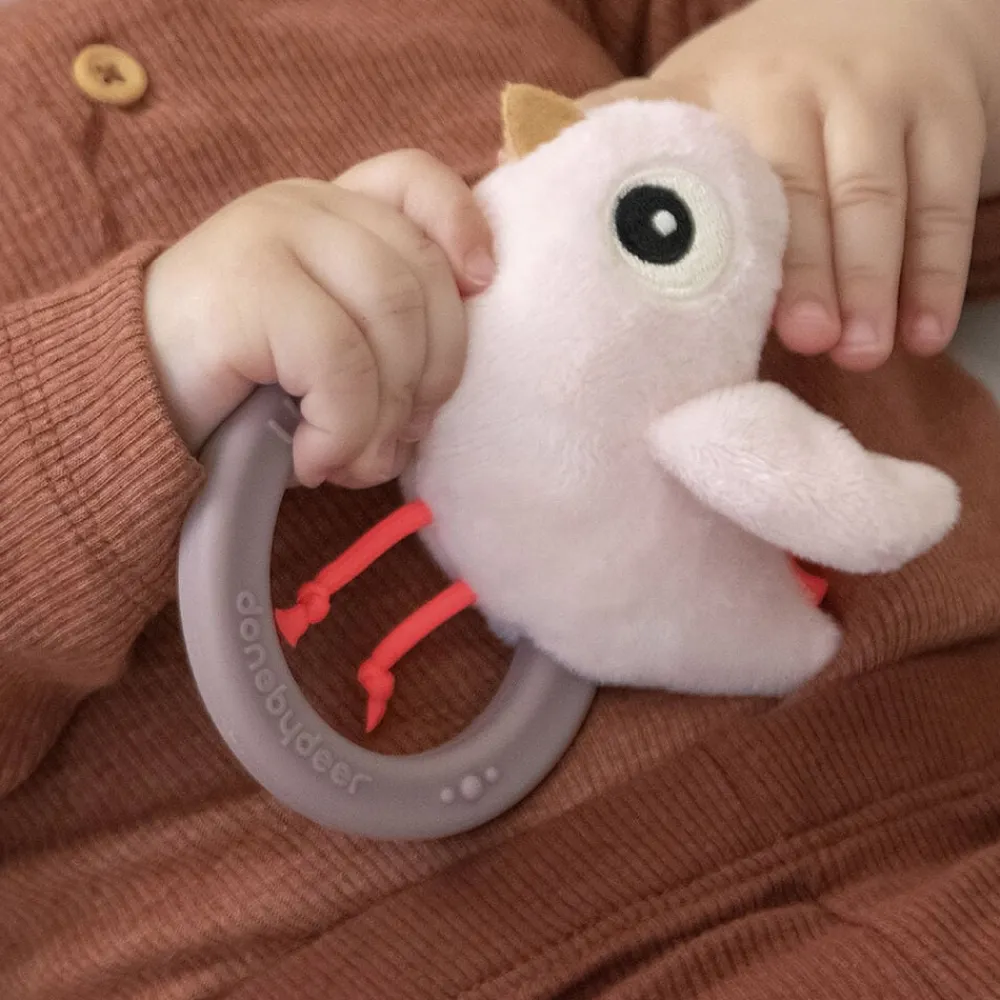 En sød Birdee sanserangle med en bidering er altid en god følgesvend for de små med ømme gummer. Den søde Birdee vil underholde dit barn med sine sansestimulerende funktioner. Sanseranglen har en sød ranglelyd, forskellige teksturer, der er sjove at udforske og vinger, der laver en skøn knitrelyd, når man rører ved dem. Stimulér din babys sanser med de cool funktioner og hjælp med at berolige de kløende gummer med bideringen. Lad dit lille barn lege med denne pudderfarvede sanserangle med Birdee og se din baby udforske de sjove og underholdende elementer.