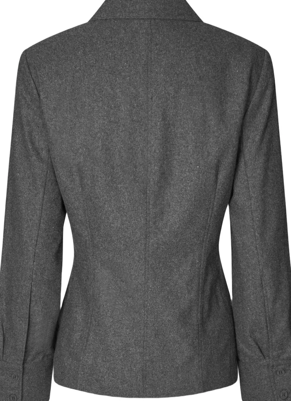 Second Female slå om-skjorte. Skjorten er fremstillet i en blød uldblanding. Hakrevers, bindebånd i den ene side og vatterede skuldre. En enkelt brystlomme og to lommer med flap. Lange ærmer med manch
