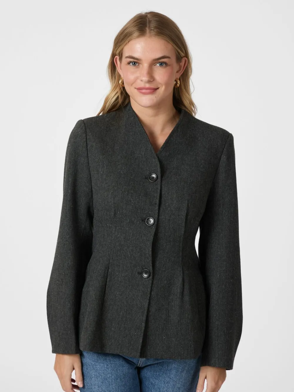 Figursyet blazer i en lækker vævet nistret kvalitet. Lukket med knapper foran og har en dekorativ halsudskæring og elegante ærmer. Modellen er 176 cm og bærer en størrelse 36