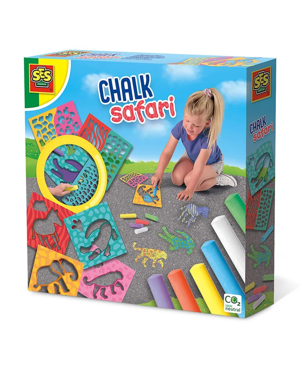 Safari gadekridt har seks plastskabeloner, som man nemt kan bruge til at tegne dyr og dyreaftryk på fortovet.