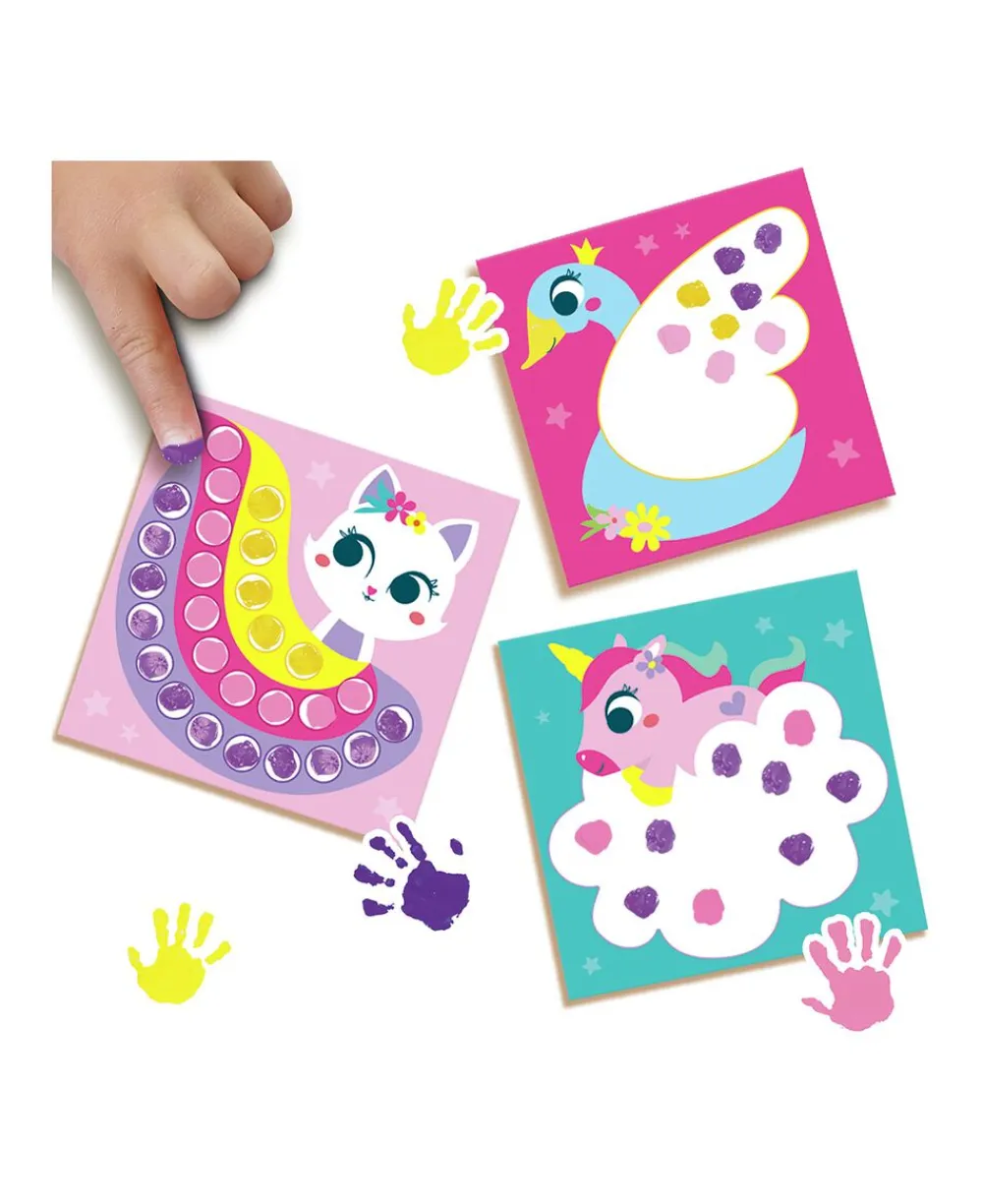 Inkluderer lyserød, gul og lilla fingermaling (45 ml af hver) og 10 x fortrykte kort med fantasifigurer.