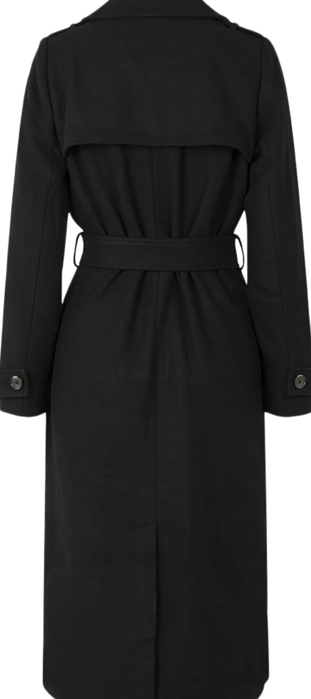 Klassisk, dobbeltradet uldfrakke med krave og revers. ShayMD coat har bredt taljebælte, skulderstropper, brede manchetter og stormflap. Med for og slids bagpå.