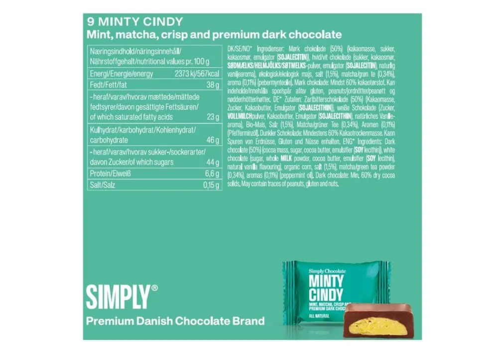 MINTY CINDY Cube m/ 9 bites. Et centrum af cremet hvid chokolade rørt med sprøde kornflager, matcha & mint overtrukket med premium mørk chokolade. En ideel kombination af smagsoplevelser! Simply Chocolate er lavet på det bedste naturen har at tilbyde. Premium kvalitetschokolade helt fri for kunstige tilsætningsstoffer.