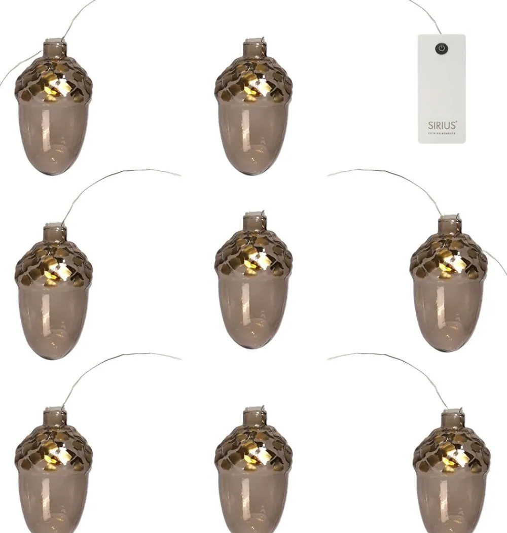 Guirlande med agern i mundblæst glas og guld dekoration på. LED lysene reflekter med et varmt lys fint i glasset.