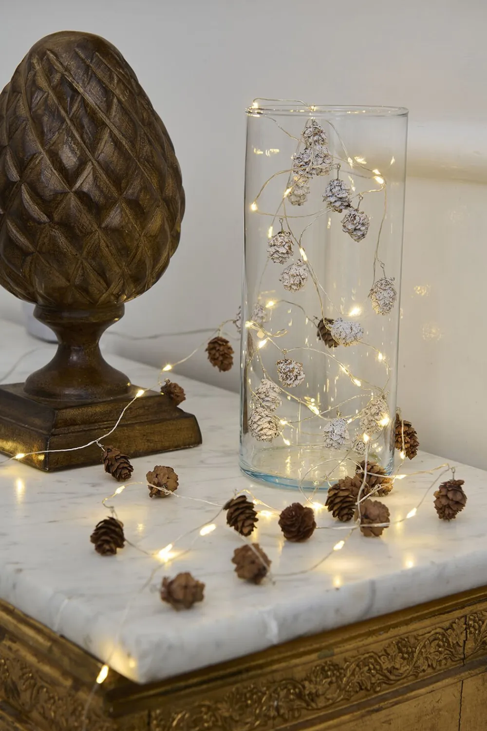 Lyskæde med kogler med sne på, den lyser med et varmt hvidt LED lys, den giver et næsten usynligt look med svævende lys pga. den tynde metaltråd lysene er monteret på. Til indendørs brug.
