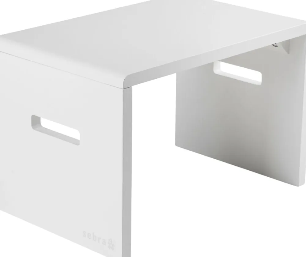 Skamlen er 23,5 cm høj og udformet, så den ikke glider ind under sengen, men forbliver stabil og sikker på gulvet, når barnet træder op på den. De medfølgende silikoneklistermærker kan påmonteres for at gøre skamlen mere skridsikre og beskytte underlaget. To håndtag, udfræset i hver side, gør den nem at flytte rundt på, og det enkle og klassiske design matcher Sebra Sengen perfekt.