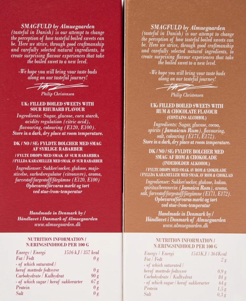 Gavepakning med 2 æsker – SMAGFULD by Almuegaarden (tasteful in Danish) is our attempt to change the perception of how tasteful boiled sweets can be. Here we strive, through good craftmanship and carefully selected natural ingredients, to create surprising flavour experiences that take the boiled sweet to a new level – We hope you will bring your taste buds along on our tasteful journey!
