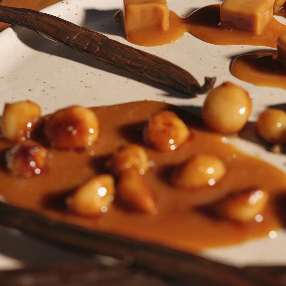En lækker, fyldig hår- og kropsduft med varme og indbydende noter af karamelliseret vanilje og ristet macadamianød, der tilfredsstiller enhver trang.