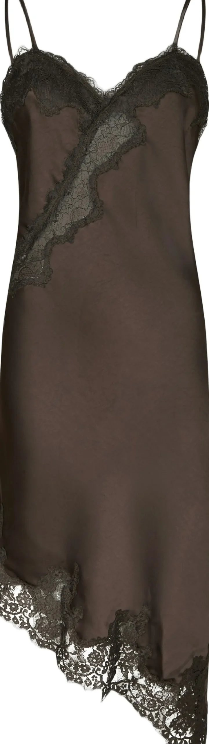 Kort kjole i satin med blondedetaljer. Kjolen har en V-udskæring, et asymmetrisk design og tynde, justerbare stropper. Den har en almindelig pasform. Modellen er iført størrelse 36.