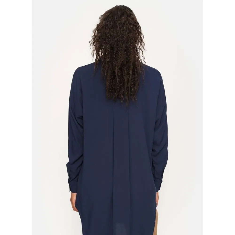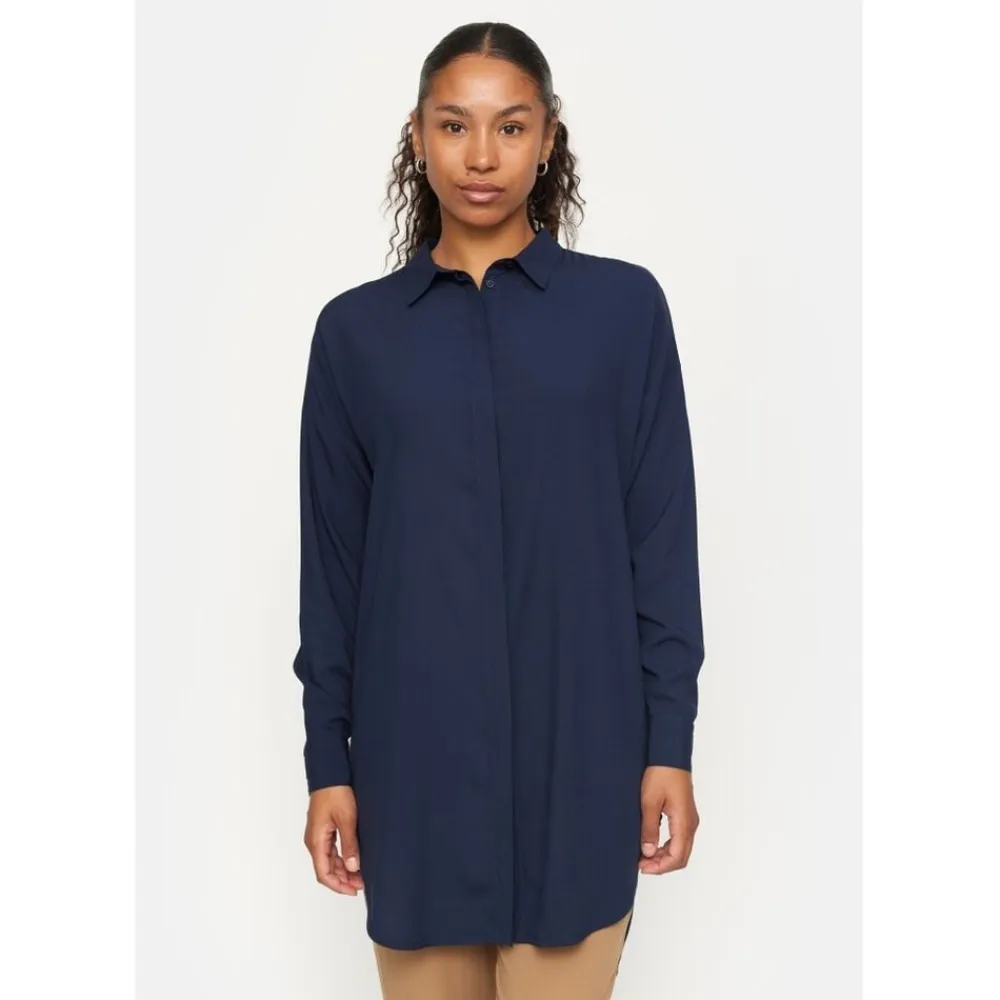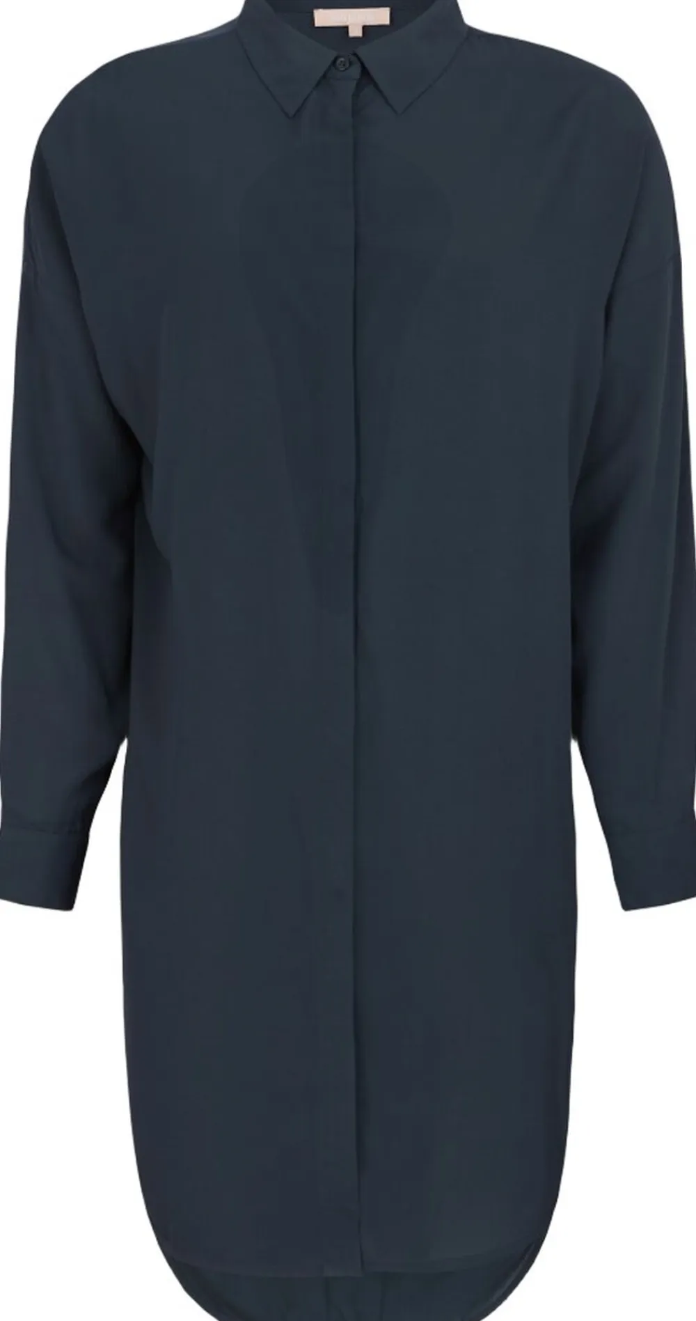 Løs løs pasform i 100 % viskosemateriale Fremstillet i et klassisk skjortelook med skjortekrave, brede skuldre og lange ærmer med manchetter med knapper kombineret med en stolpelukning foran med skjulte knapper. Den fulde længde er 96 cm i størrelse S Modellen er iført størrelse S – Løs-fit – Collar – Wide shoulders – Long sleeves – Button cuff – Skjult knapstolpe foran LENZING og ECOVERO er varemærker tilhørende Lenzing AG