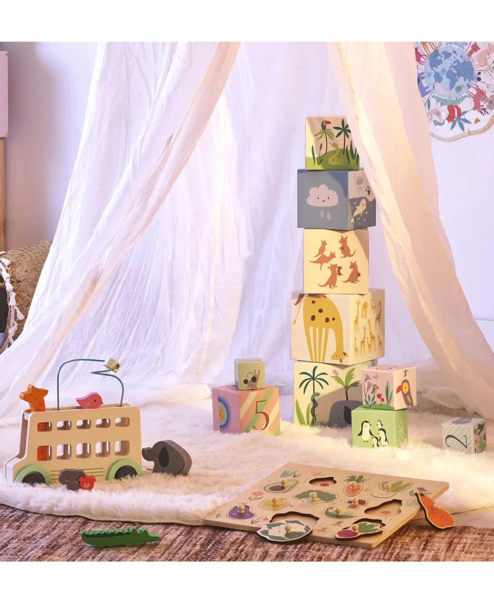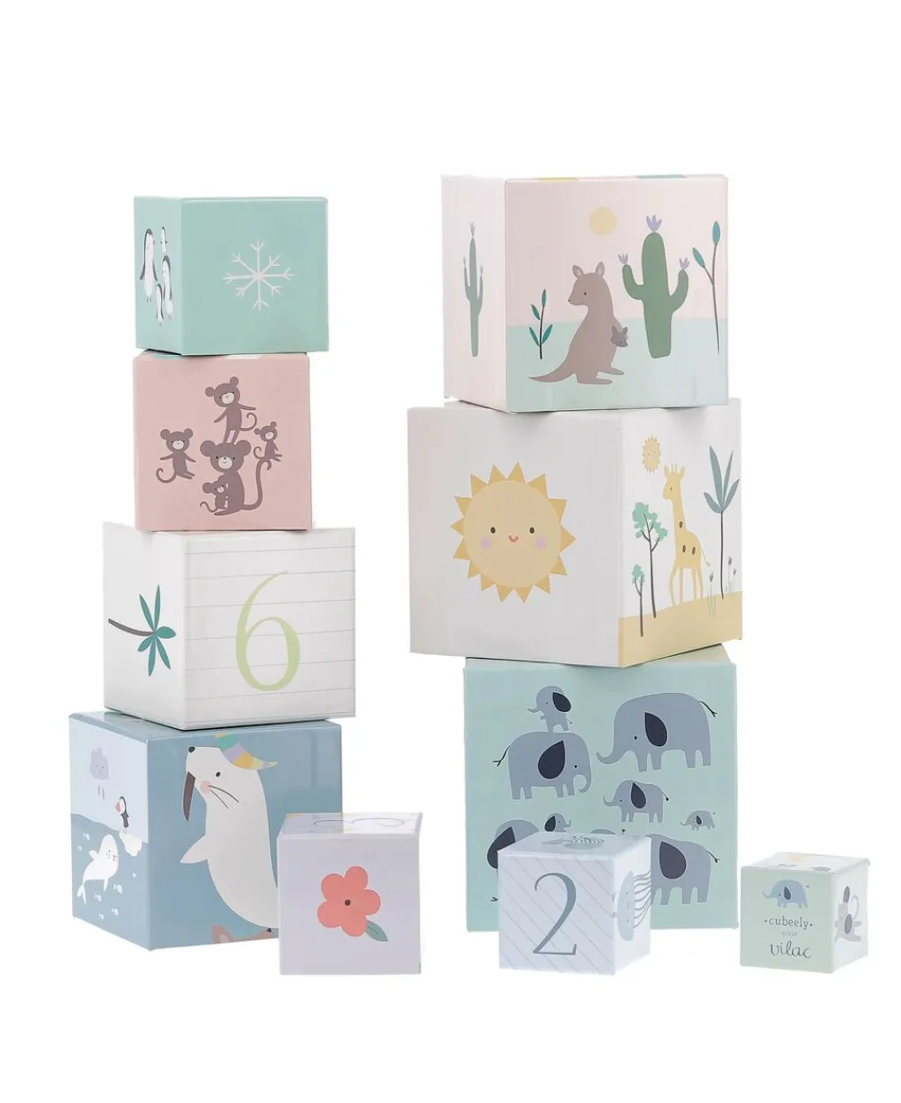 10 kraftige kuber med illustrationer af et univers befolket af dyr, ting at se i naturen og numrene 1-10.