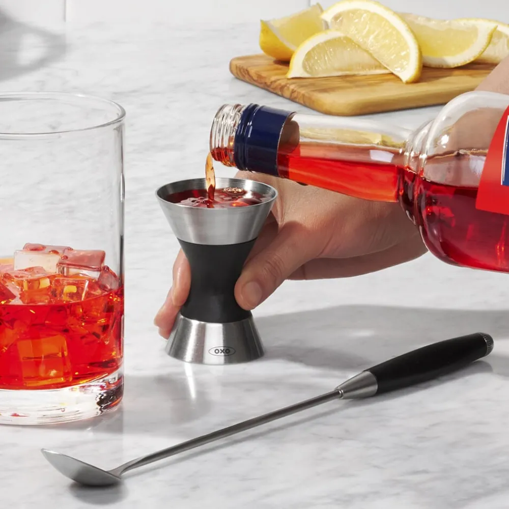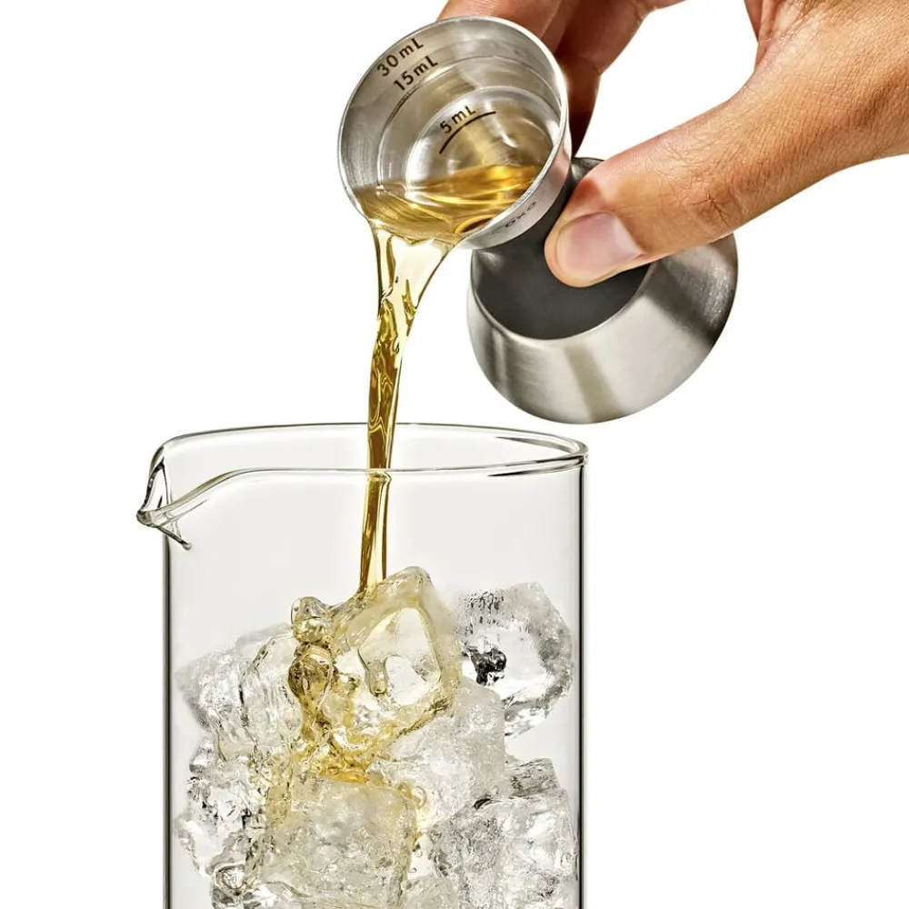 OXOs Steel Dobbelt Målebæger er uundværlig i enhver hjemmebar. Den er ikke bare praktisk, den har også et elegant look i børstet rustfrit stål med blødt non-slip greb midt på. Den ene side måler 5, 15 og 30 ml. Den anden side måler 10, 20 og 50 ml.