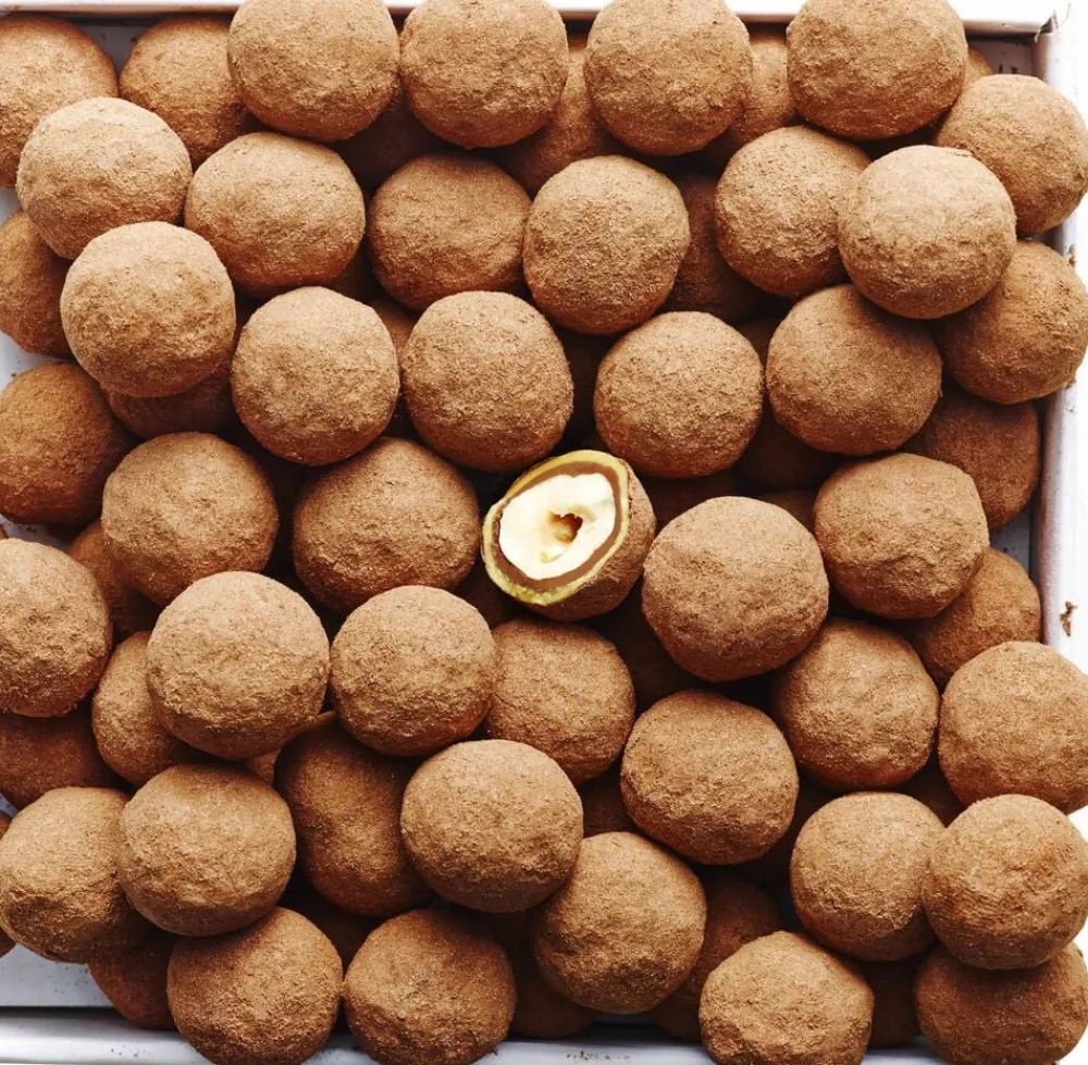 Let ristede økologiske Piemonte-hasselnødder, drageret i praliné, kaffe, Amber Classic-chokolade og vendt i fnuglet kakaopulver. En hasselnød med dybde fra den karamelliserede Amber Classic-chokolade, aroma fra den friskmalede kaffe og umami fra de sprøde Piemonte-hasselnødder.