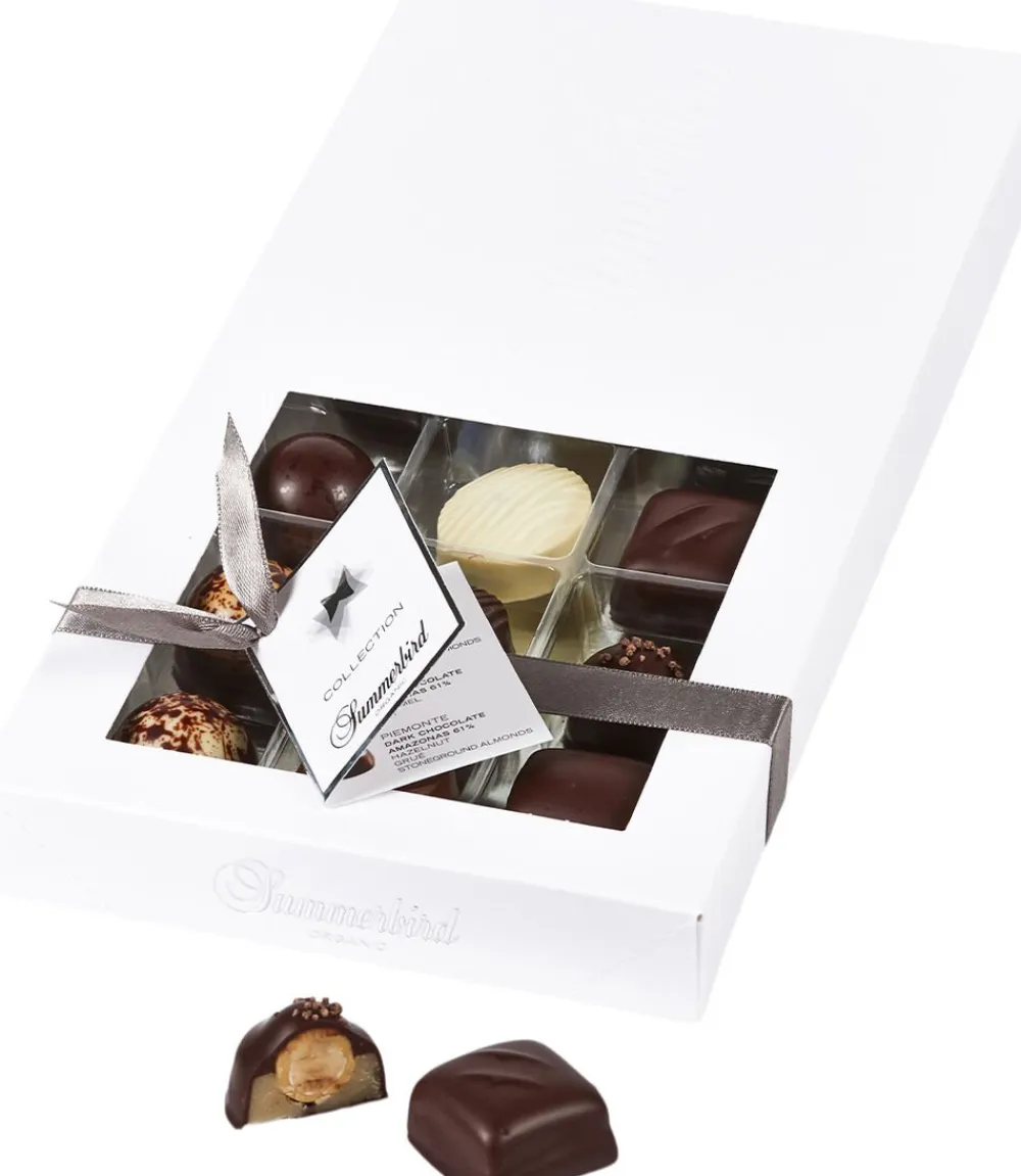 Collection 18 indeholder 9 forskellige varianter af vores raffinerede, klassiske fyldte chokolader. Æsken byder delikat velsmag i form af blandt andet marcipan af stenvalsede middelhavsmandler, praliné, mynte og karamel.