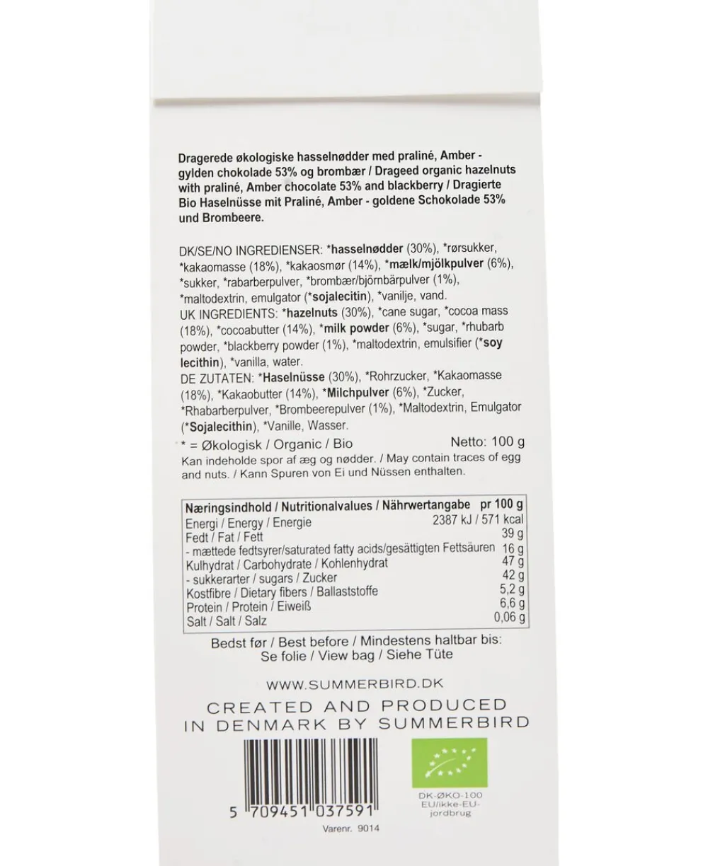 Let ristede økologiske Piemonte-hasselnødder, drageret i praliné, Amber Noir-chokolade og vendt i det fineste pulver af solmodne brombær. En hasselnød med frugtighed og syre fra de solmodne brombær, dybde fra den karamelliserede Amber Noir-chokolade og umami fra de sprøde Piemonte-hasselnødder.