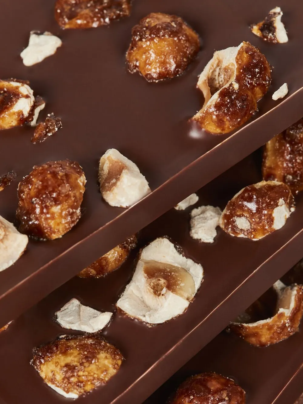 En chokoladebar, baseret på vores Amber Noir-chokolade og drysset med krokant af økologiske Piemonte-hasselnødder. En aromatisk chokoladebar med en sprød tekstur og noter af karamel, mørk rom og vanilje.