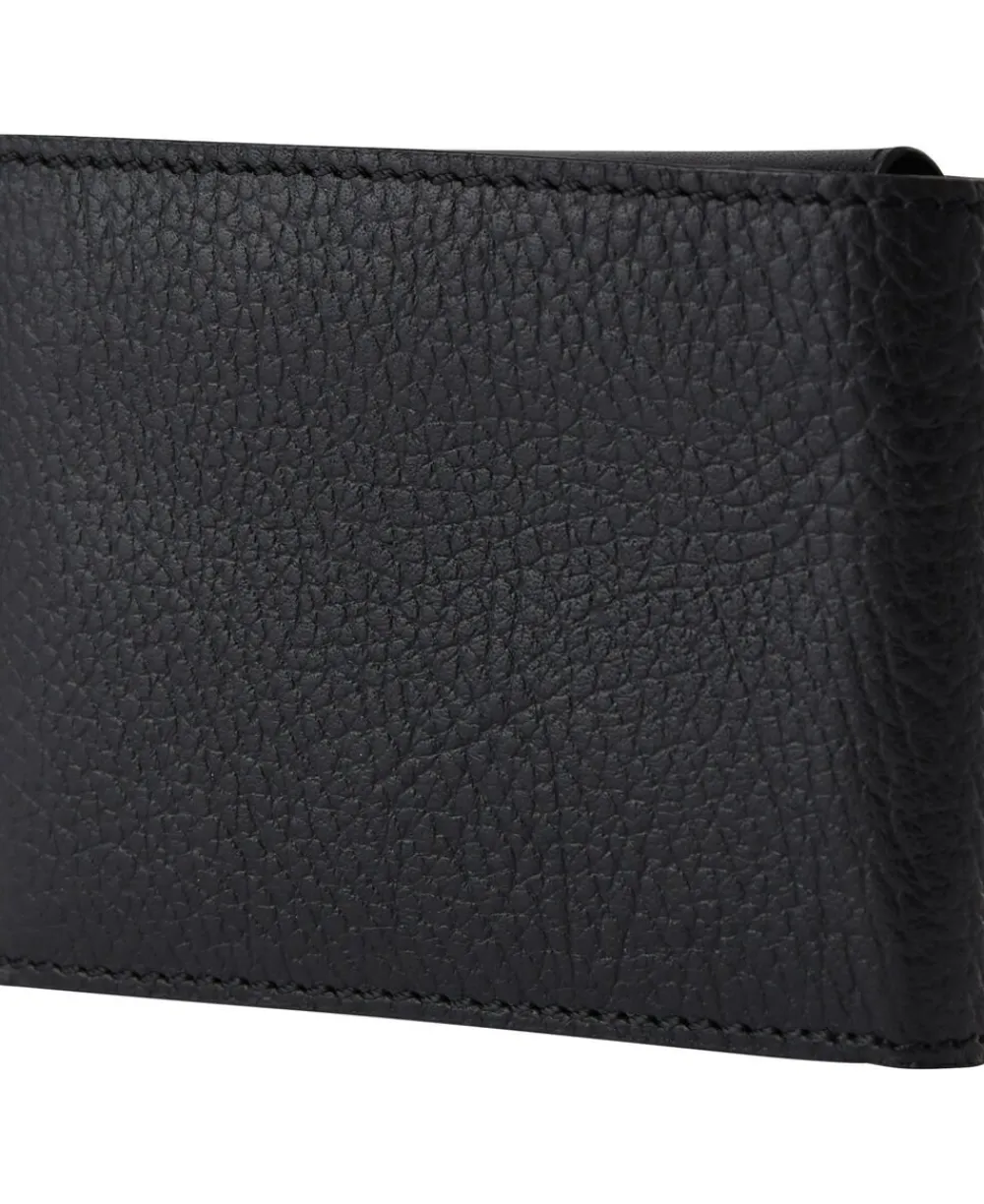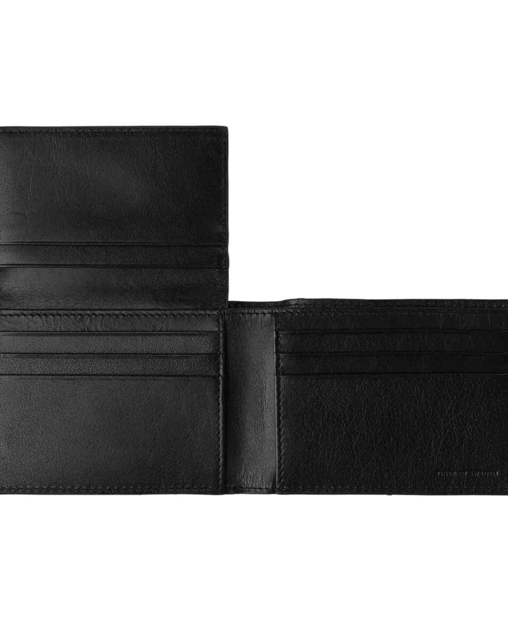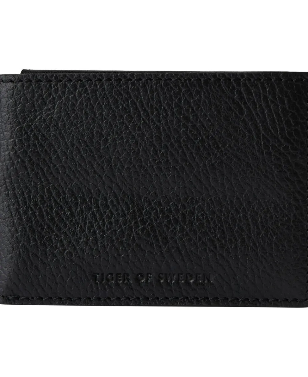 Folded wallet in soft grainy leather with smooth leather trimmings. Large open note compartment at top. Inside features three open pockets and ten card slots. RFID anti-skimming lining. Embossed Tiger of Sweden logo at the front. Size: 8 x 11 cm