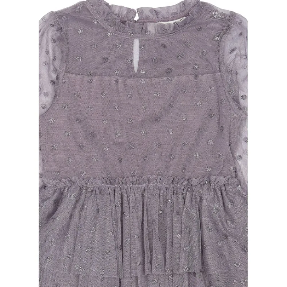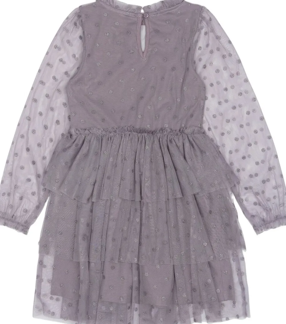 Fortryllende smuk langærmet kjole med flæser fra THE NEW, der er dekoreret med små prikker over hele kjolen. Denne meshkjole fra THE NEW har tynde, transparente ærmer og en underkjole lavet af blødt og åndbart materiale. Det er en fantastisk smuk og glamourøs festkjole, perfekt til festlige anledninger. – Kort kjole, der slutter lige over knæene. – 3 lag flæser i skørtet giver kjolen et ekstra fyldigt, feminint og festligt look. – Elastik ved håndleddene. – Slids med elastisk knaplukning i halsen.