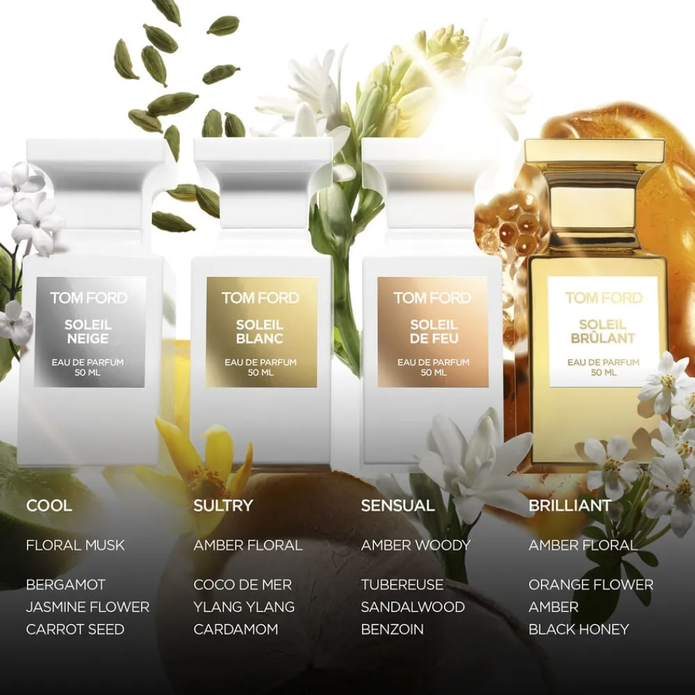 Overraskende. Dragende. Vanedannende. Inspirationen bag Soleil Blanc er den eksotiske rejse til private øer, hvor sommeren varer hele året, og hvor den ene dag ubemærket smelter sammen med den næste. En vanedannende, solrig, blomstret amber duft med forførende elegance og forfriskende dekandance. Tom Fords seneste Private Blend kreation udstråler ulasteligt den endeløse jagt på sol og luksus, der definerer Tom Ford Soleil.