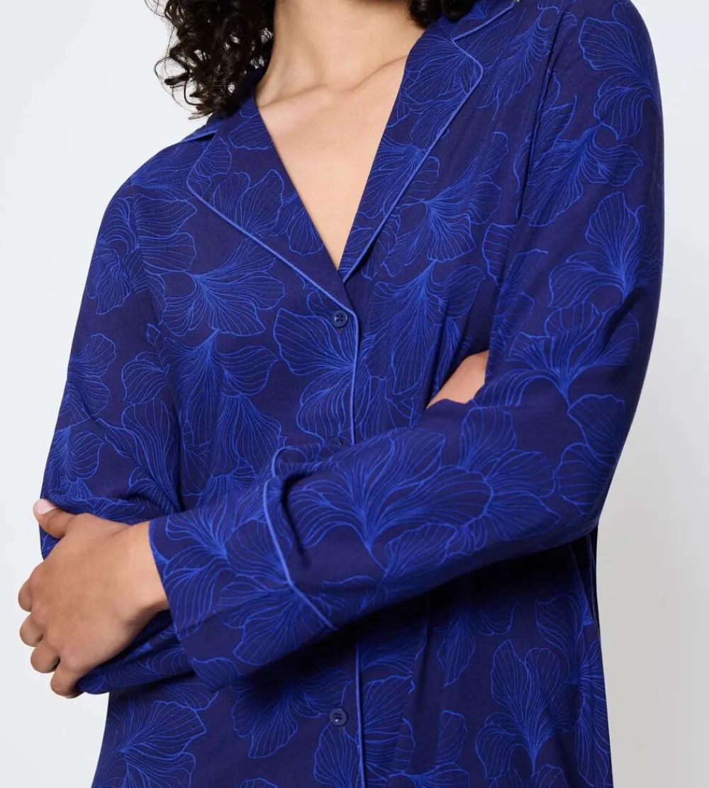 Langærmet Boyfriend-natkjole med afslappet pasform, klassisk krave og kontrastfarvede kantebånd. Designet med blødt, åndbart stof.