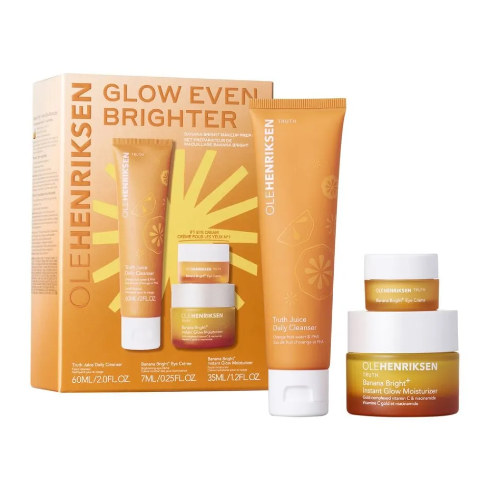 Glow endnu stærkere med denne bestseller-trio: Rens med Truth Juice Daily Cleanser for at opfriske og energisere, fugt og lys med Banana Bright+ Instant Glow Moisturizer, og reducer mørke rande og forbedr concealerens holdbarhed med bestseller Banana Bright+ Eye Crème.Truth Juice Daily Cleanser: Renser uden at strippe Fjerner snavs, olie & langtidsholdbar øjenmakeup 100% er enige i, at det efterlader huden lys og fornyet I et klinisk studie af 35 personer, efter 1 brugBanana Bright+ Instant Glow Moisturizer: 100% er enige i, at det forbedrer makeupens udseende Lysner øjeblikkeligt + 30% lysere hud over tid Fugter huden i 24 timer I et 8-ugers klinisk studie af 35 personer*Banana Bright+ Eye Crème: 20% lysere under øjnene* Forbedrer og forlængger concealerens holdbarhed 95% er enige i, at det lysner træt og mat hud* I et 8-ugers klinisk studie af 38 personer
