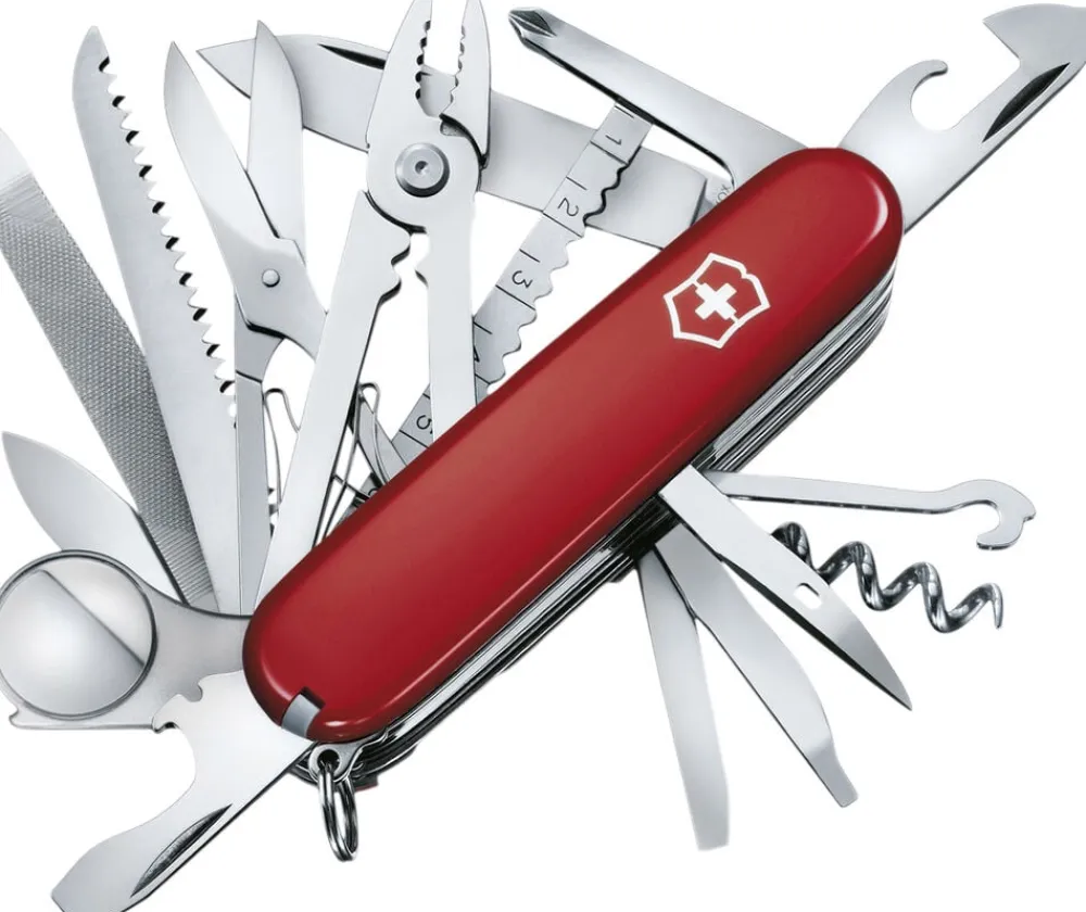 Swiss Champ er udstyret med en bred vifte af værktøjer der gør den velegnet til reparationer friluftsliv hobbyprojekter og meget mere. Fra sakse og skruetrækkere til en lup og en sav uanset hvad situationen kræver har du med Swiss Champ det rigtige værktøj lige ved hånden.